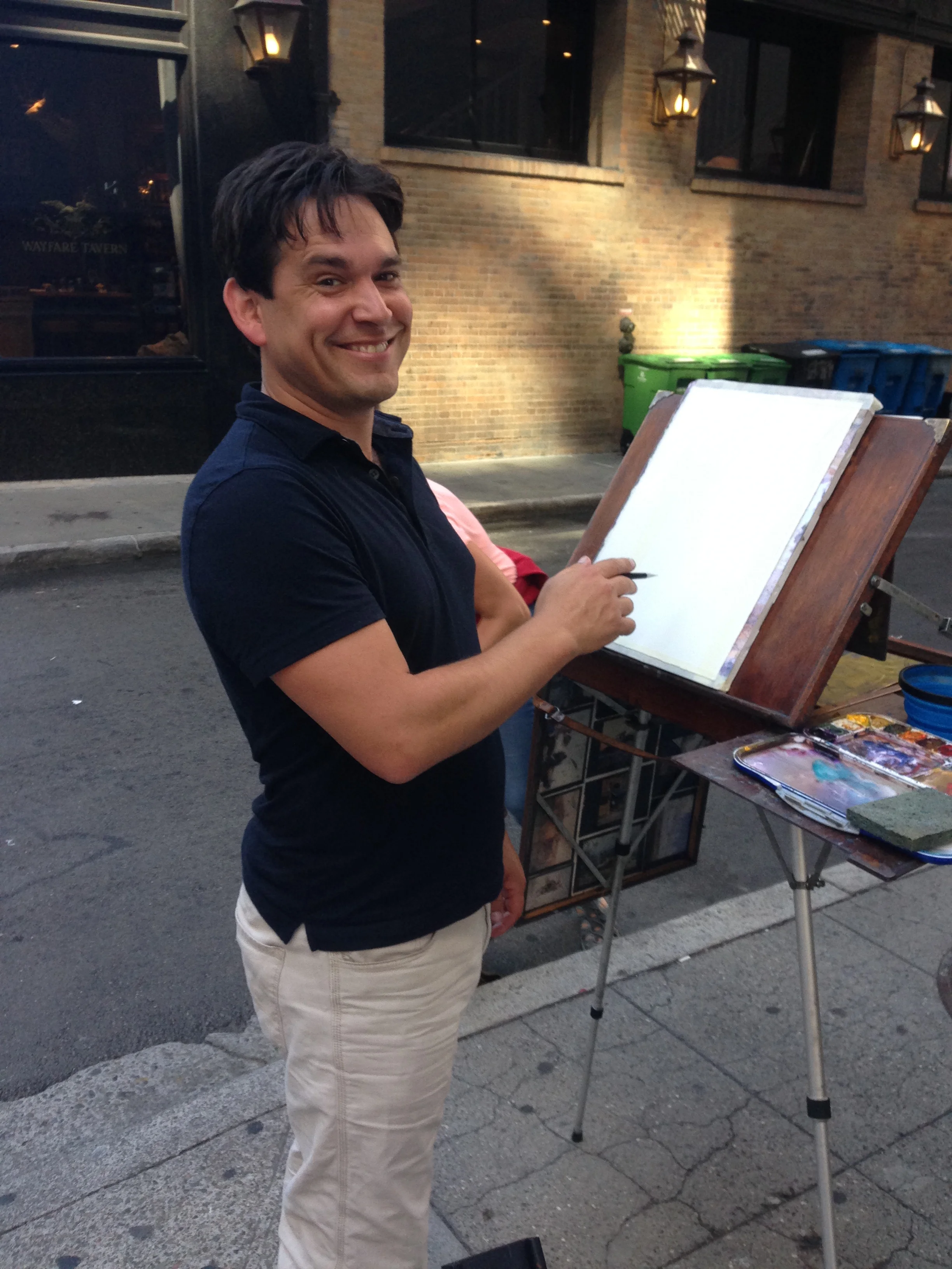 This is in the Financial District. The perspective was very dramatic. Something that bothered me about my piece, after I was done, was that I sort of "chopped off" the tall building to the left of the street. At an earlier point in the painting, the building below it did not jut out all the way to the right edge of its silhouette, but in the process of working on values and shapes, I split the large "block" of buildings into two distinct shapes. This was a mistake that Joseph pointed out to me, and I agree wholeheartedly. The goal would be to better integrate the shapes, like a game of Tetris, using "hooks" and "funnels" to create that visual velcro Joseph was talking about. Also, notice how "clean" the street is on my hill, versus Joseph's. There's just enough abstract business to make it read on his. Something to work on!