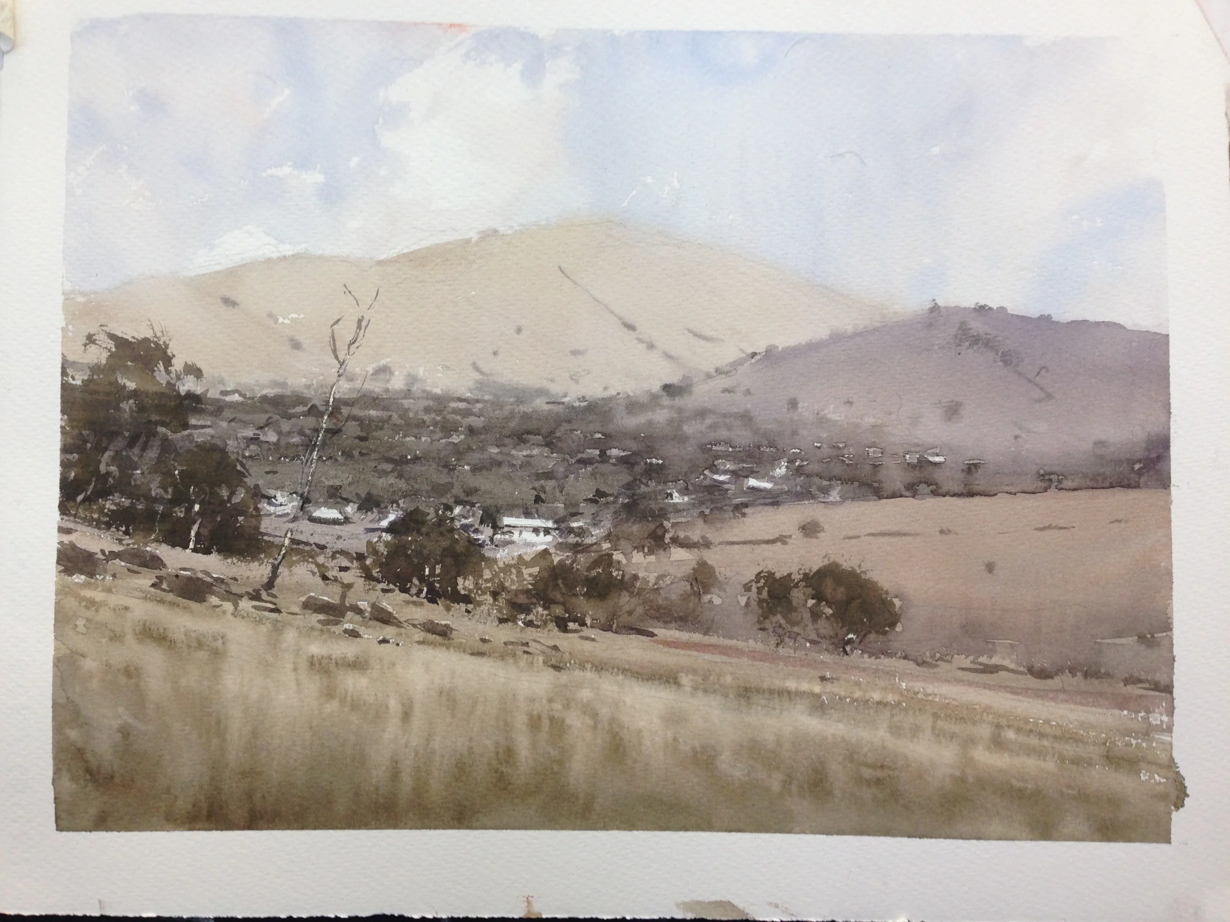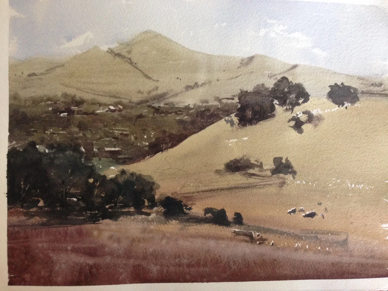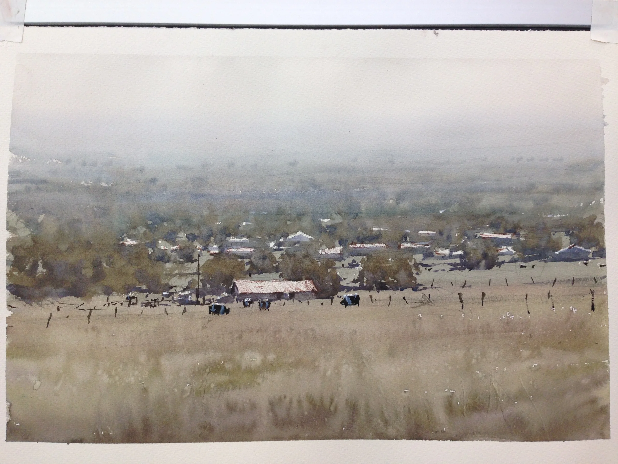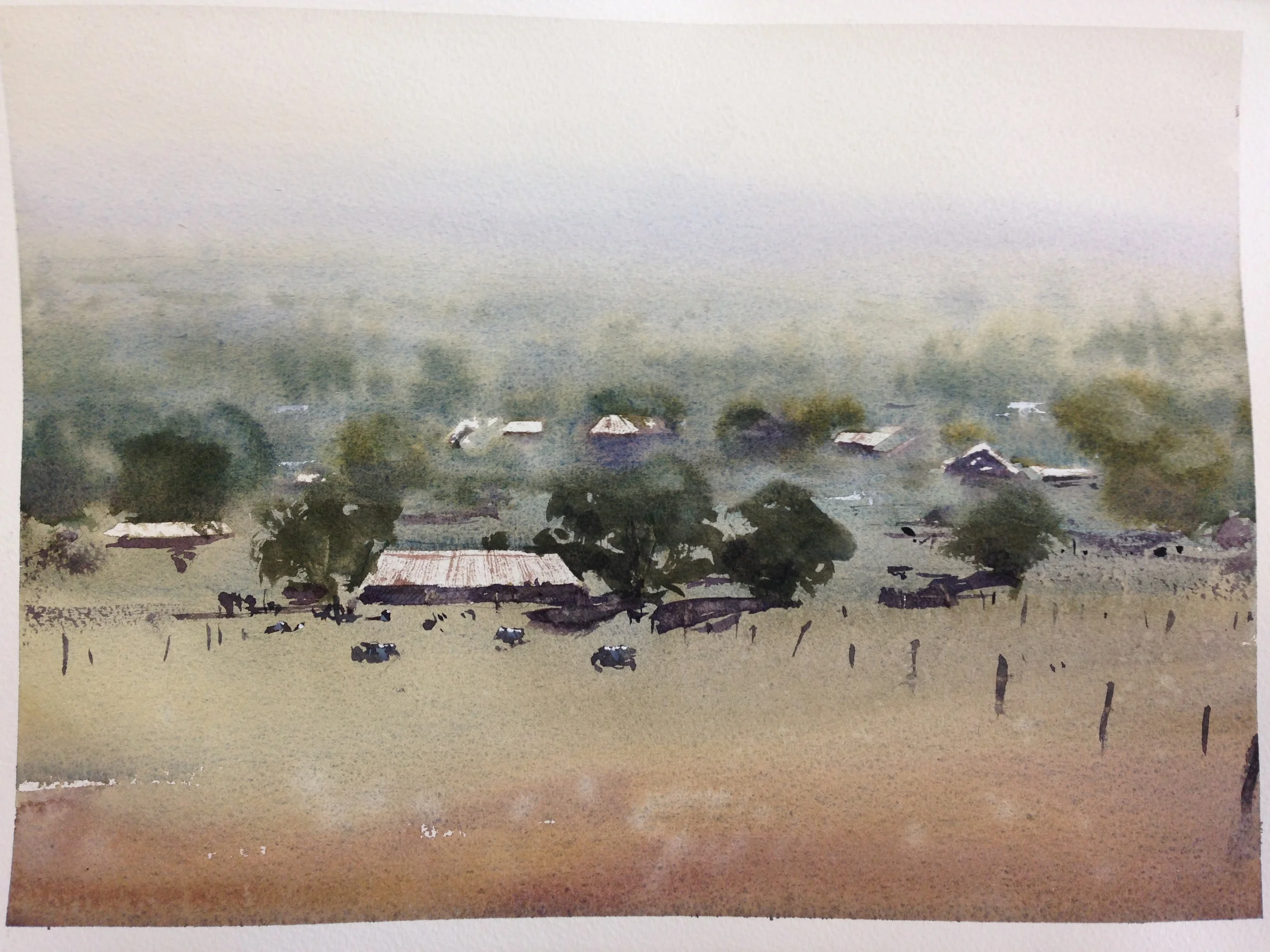The first of the bunch. A lot of wet into wet work up top. Joseph's distant trees have a bit more form to them- mine dissolved a bit, either because I went back in too early, or I had too much water on my brush. I'd never done cows before, but muddled my way through. Getting that magical foreground was the hardest part of it- it's more difficult than Joseph makes it look. Put in the water too early, and it all disperses (like me). Put it in too late, and you get blooms (others got those). He dropped in more fence posts towards the end, to pull you in to the midground.