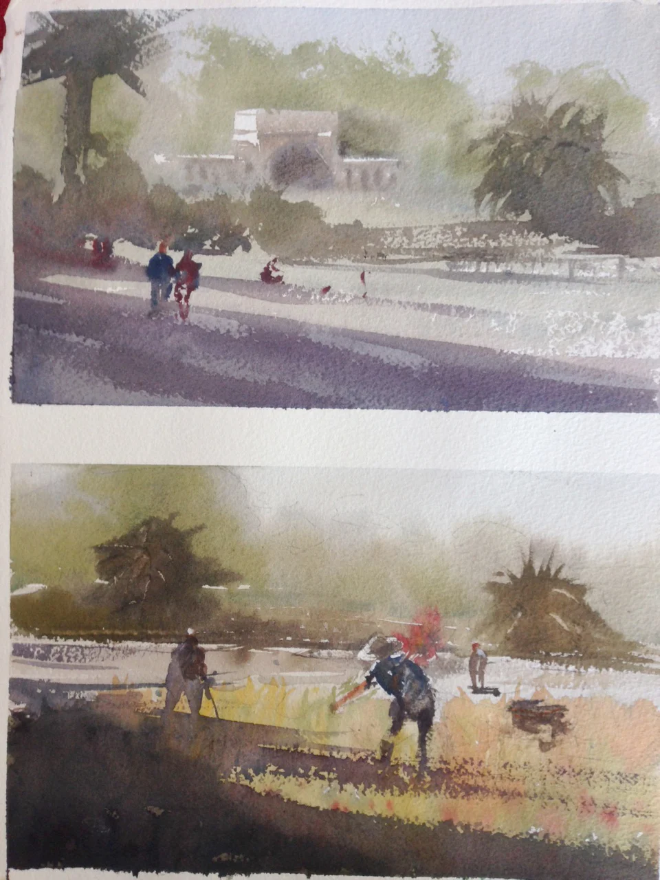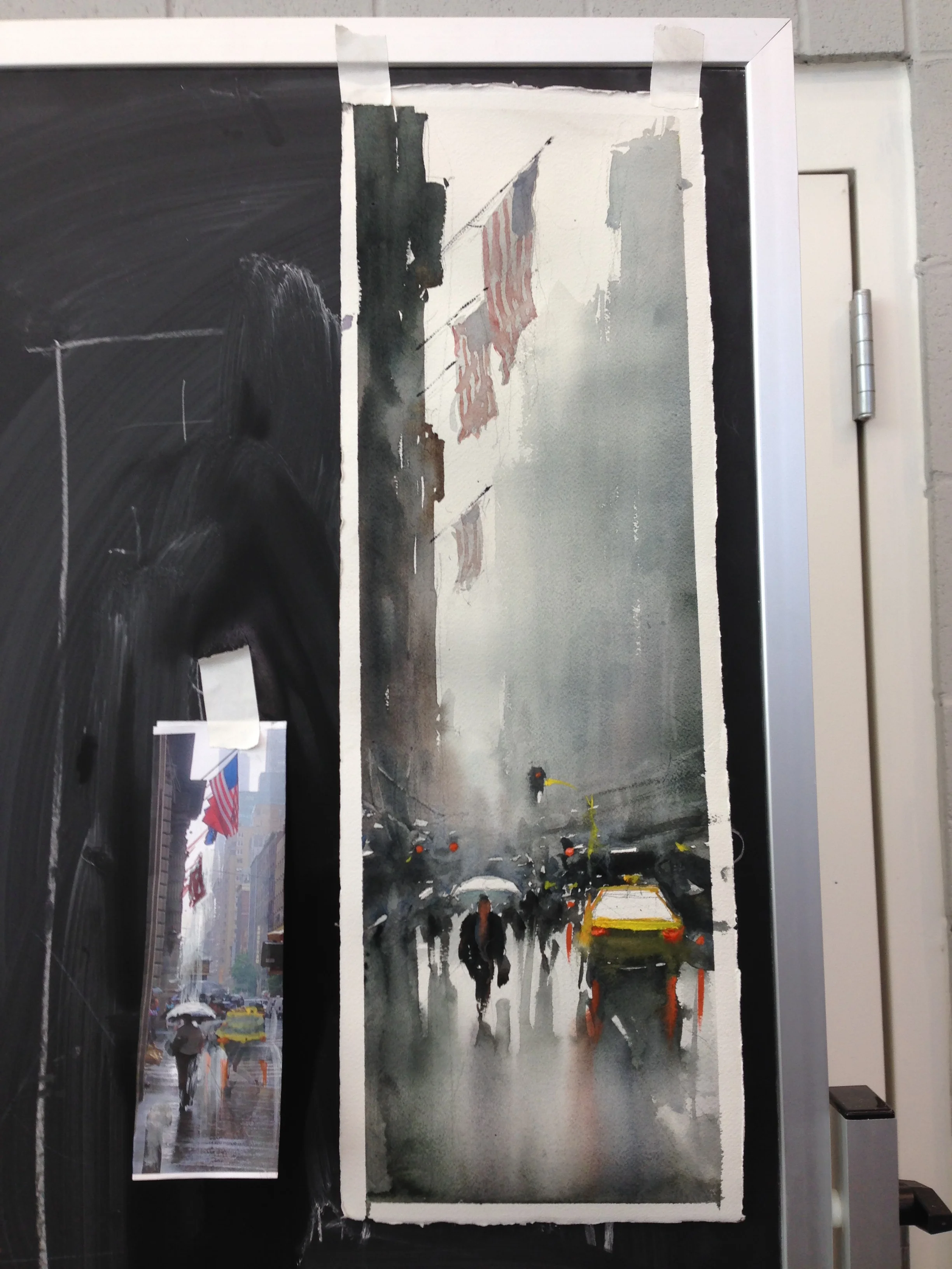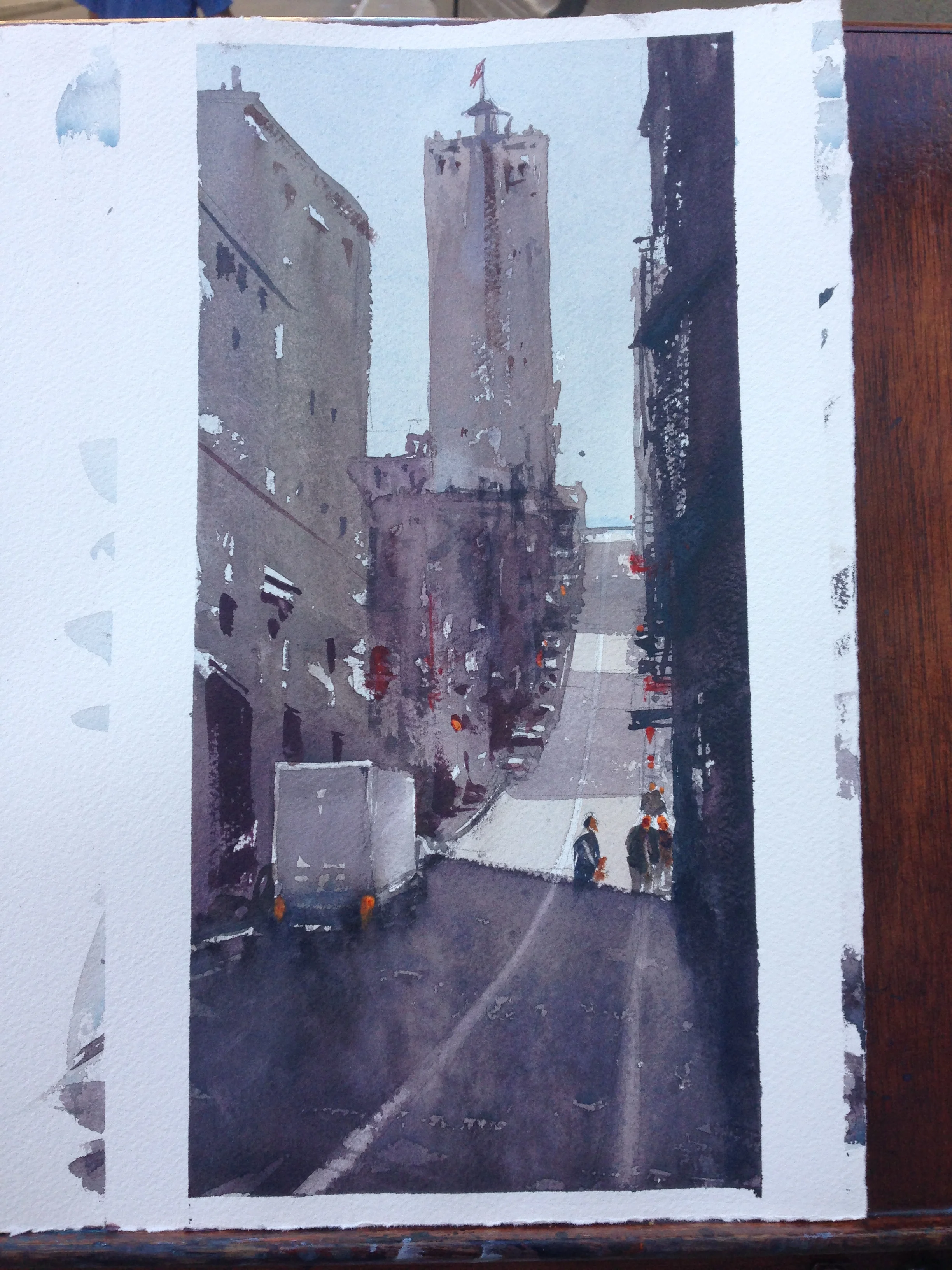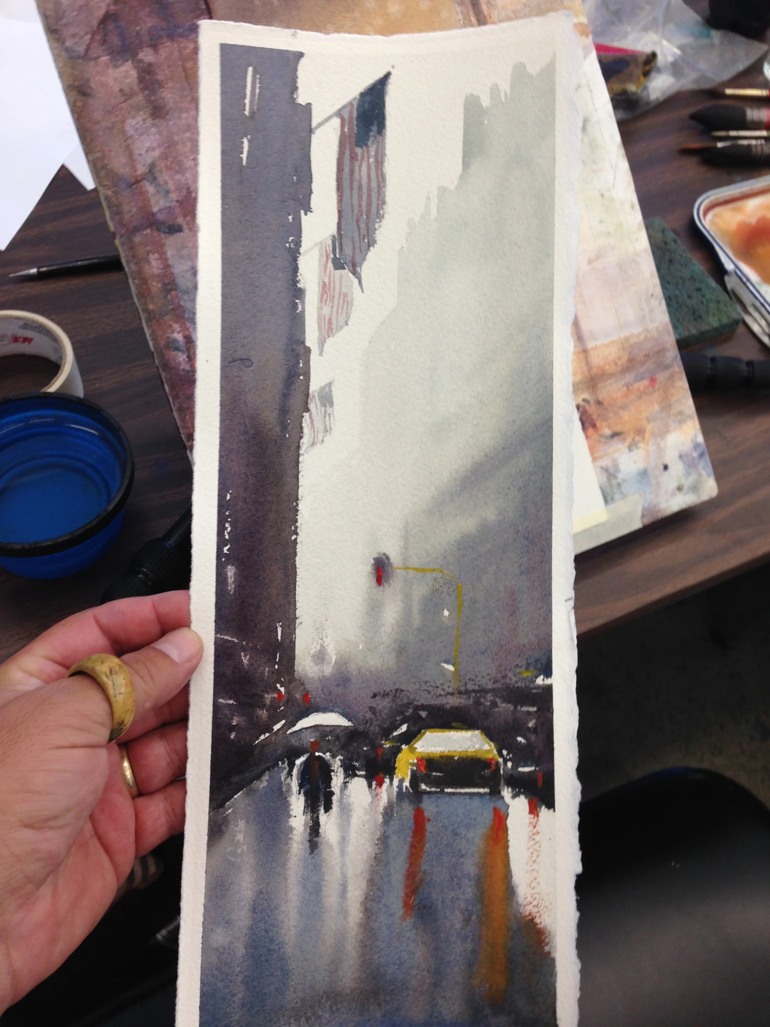 This came out ok, IMO. There's something more dynamic in his building on the left. There's more shift in value, creating a sense of depth. I dropped my darker values in, wet into wet, a little too early (clearly a common problem for me!), and they dispersed. His people have a wonderful sense of motion t them, that I would like to get into mine as well. He commented about needing to get the shoulders uneven, to capture a sense of active balance.
