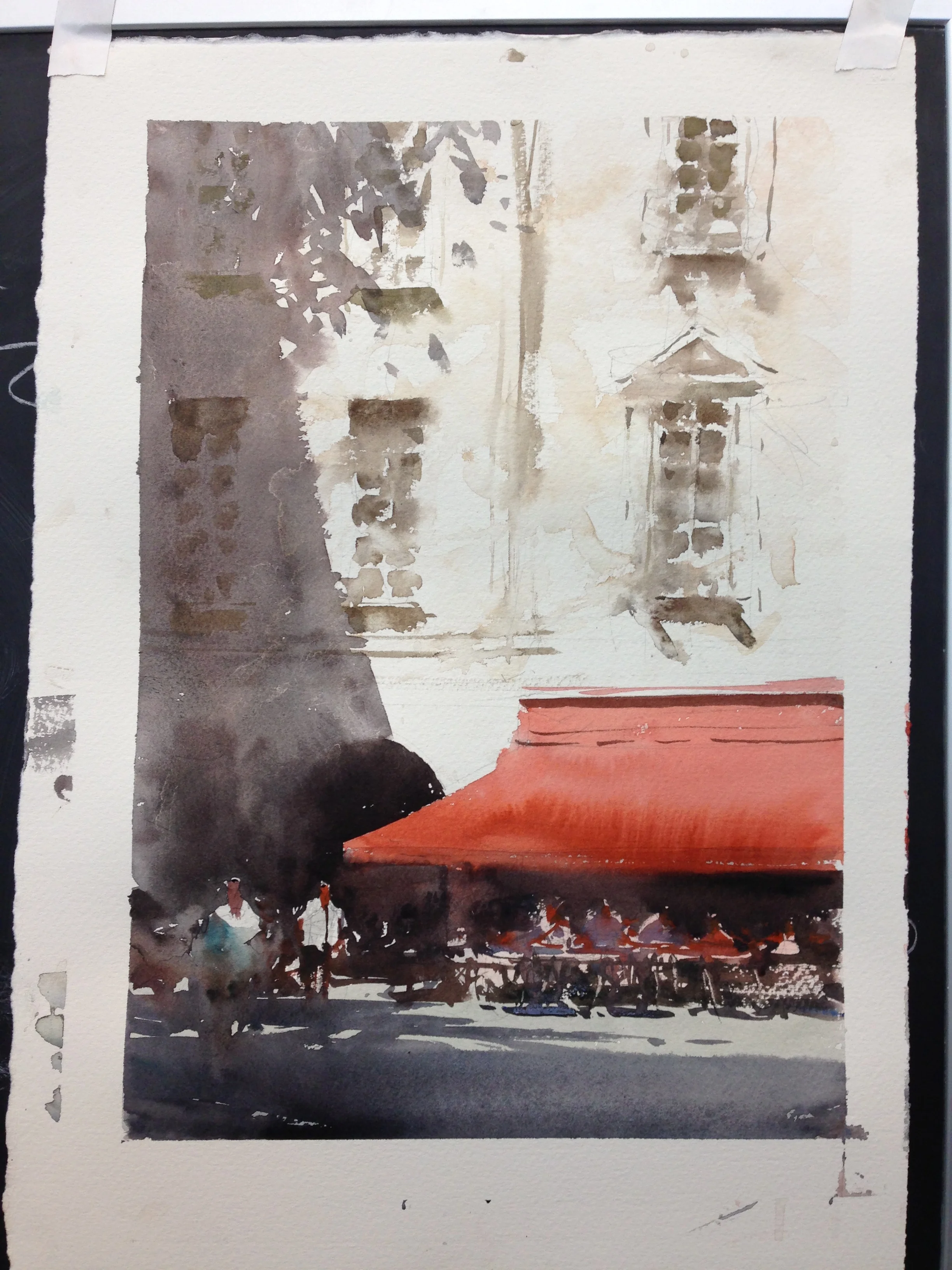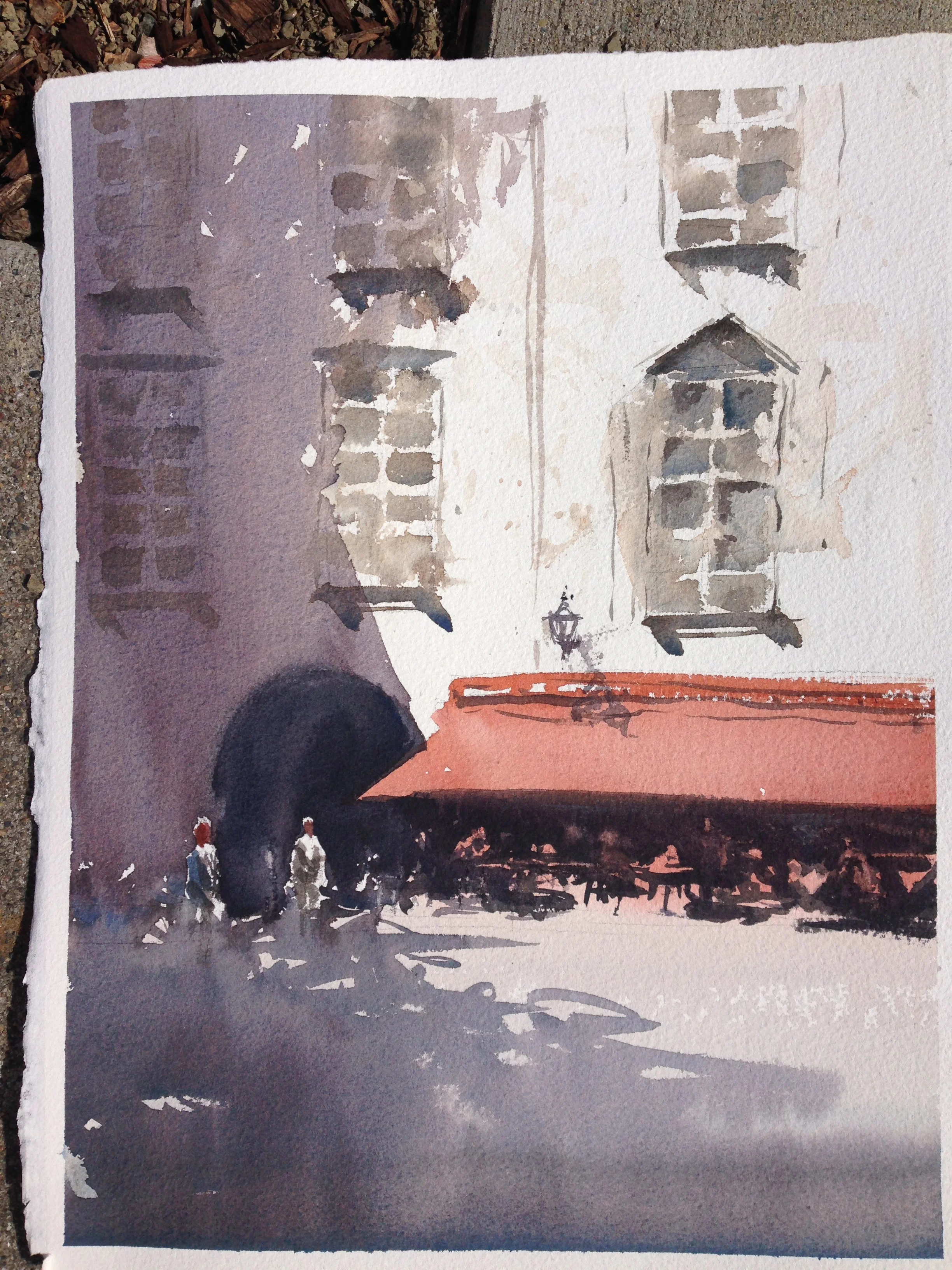 Over the course of the week, I began to see how Joseph was very picky about when he was loose and expressive with his brushwork, and when he was very tidy and slow. I actually like my windows and the foreground shadow, but looking at the awning, I can see how straight his is. This is important for it to read as an awning, because it's a manmade shape. Same goes for my tables and chairs. I feel like I got the idea right, but a bit more precision here and there would do wonders. It's not, IMO, the abstract work that is my issue, but that everything lists to the left (an ergonomic problem, being right handed) . He told me more than once that I should "be loose, and let watercolors play. But then you have to choose where you want some finesse, and pay attention to those areas. Those spaces will help the loose spaces have meaning." This is clearer as I look it over. Some people have issue with keeping things too tight, but I feel like I've got the opposite problem and need to learn to selectively reign it in a bit.