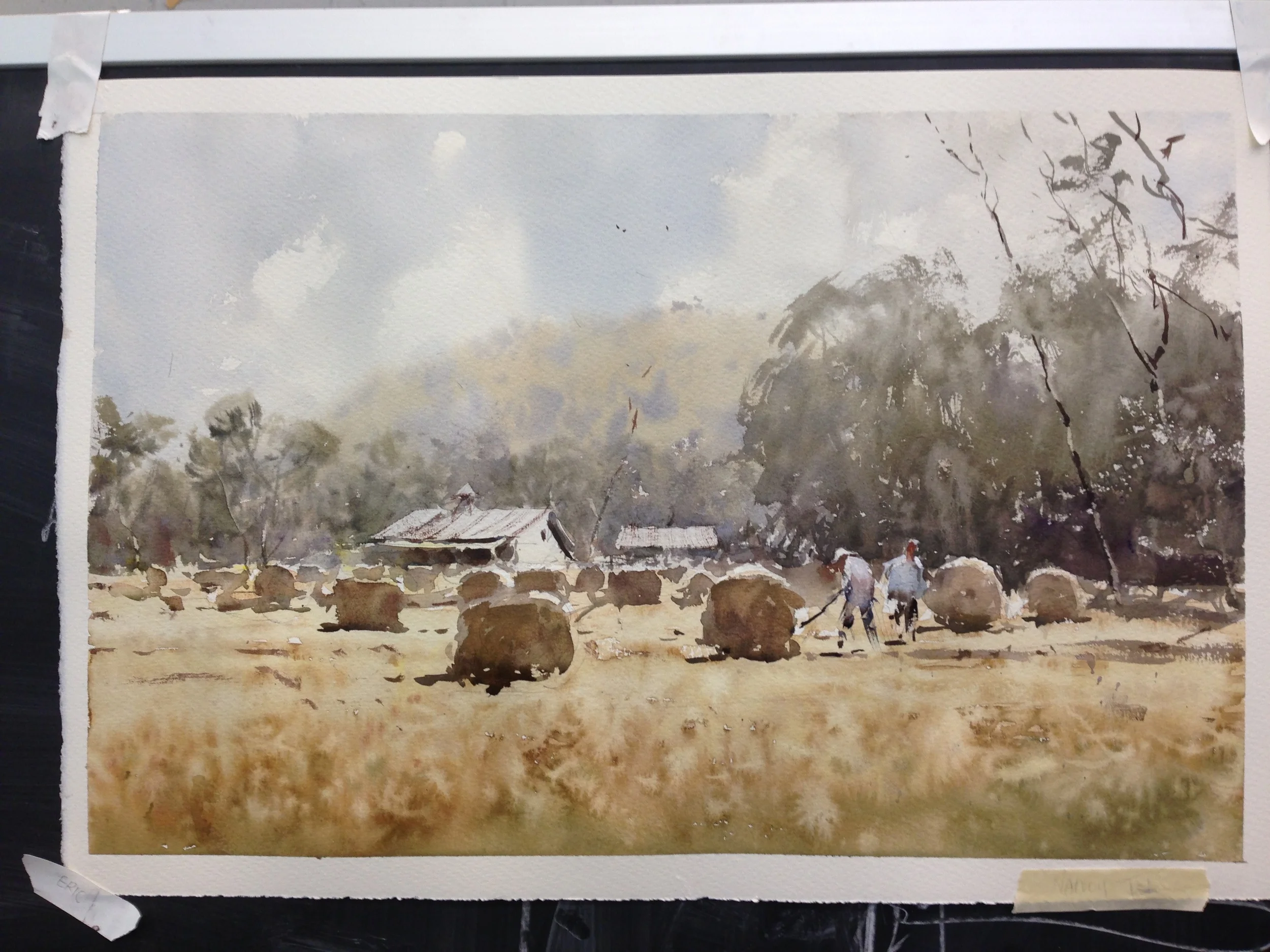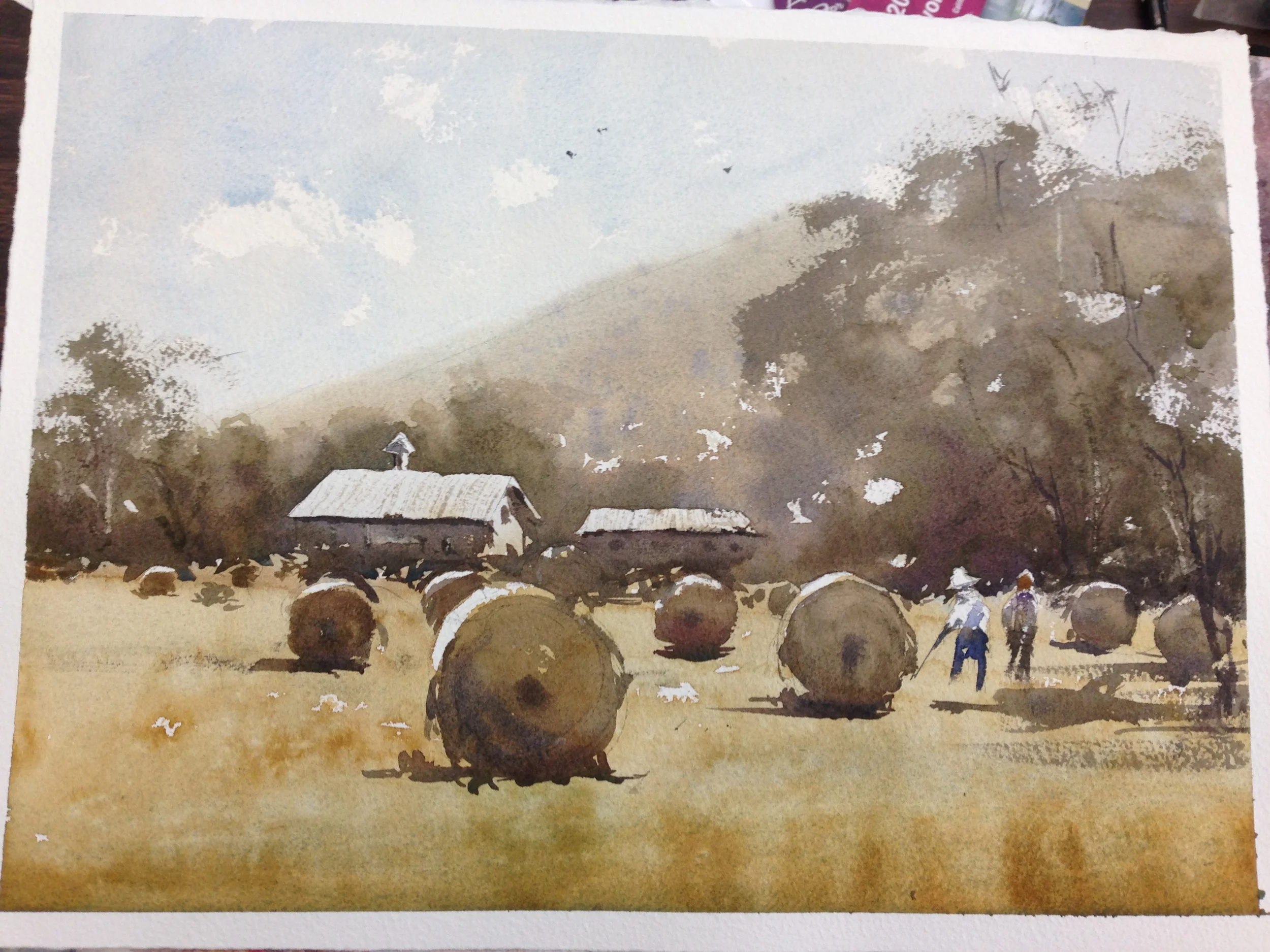 I really LOVE the way he does the loose grass here, but was just not quite able to capture it. I suppose it's better than the grass I did on #1, but it's still too early. I'm ok with the background, and my buildings, all in all, but I now see how my bales of hay have encroached on the foreground. Joseph's has a sense of distance and expansiveness that stems from the more open foreground. Big Idea #1. Also, at first, my bales were very cleanly circular. He came over and scruffed up the edges some. He told me it's because that's how they look in real life, but I think it's also because it provides little "hooks" for the darker values to connect themselves to the foreground. Check out how his trees also "hook" onto the sky, and bond the mid and background together by doing so. A neat detail? The story he tells is that there were no workers there that day, but that instead he added them, to tell a story. As he did the demo, he pulled out a photo of some janitors he had taken, and used them in the painting.