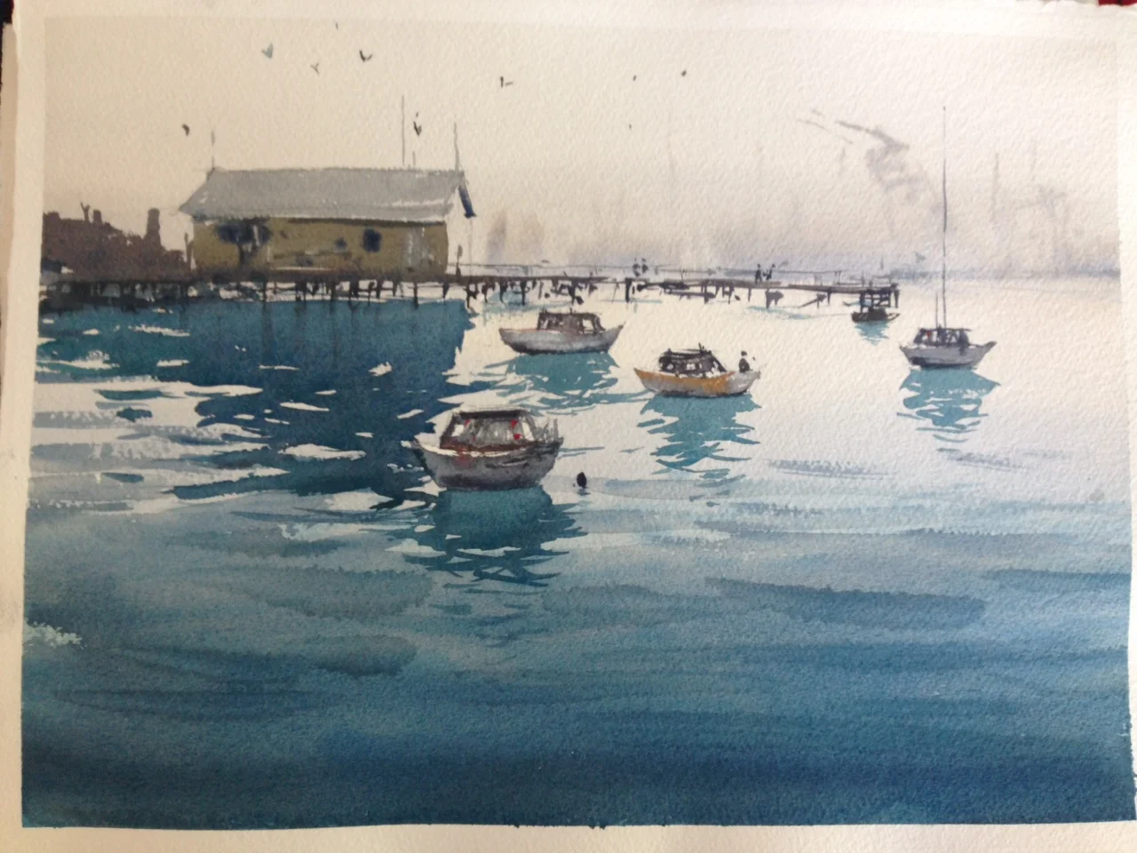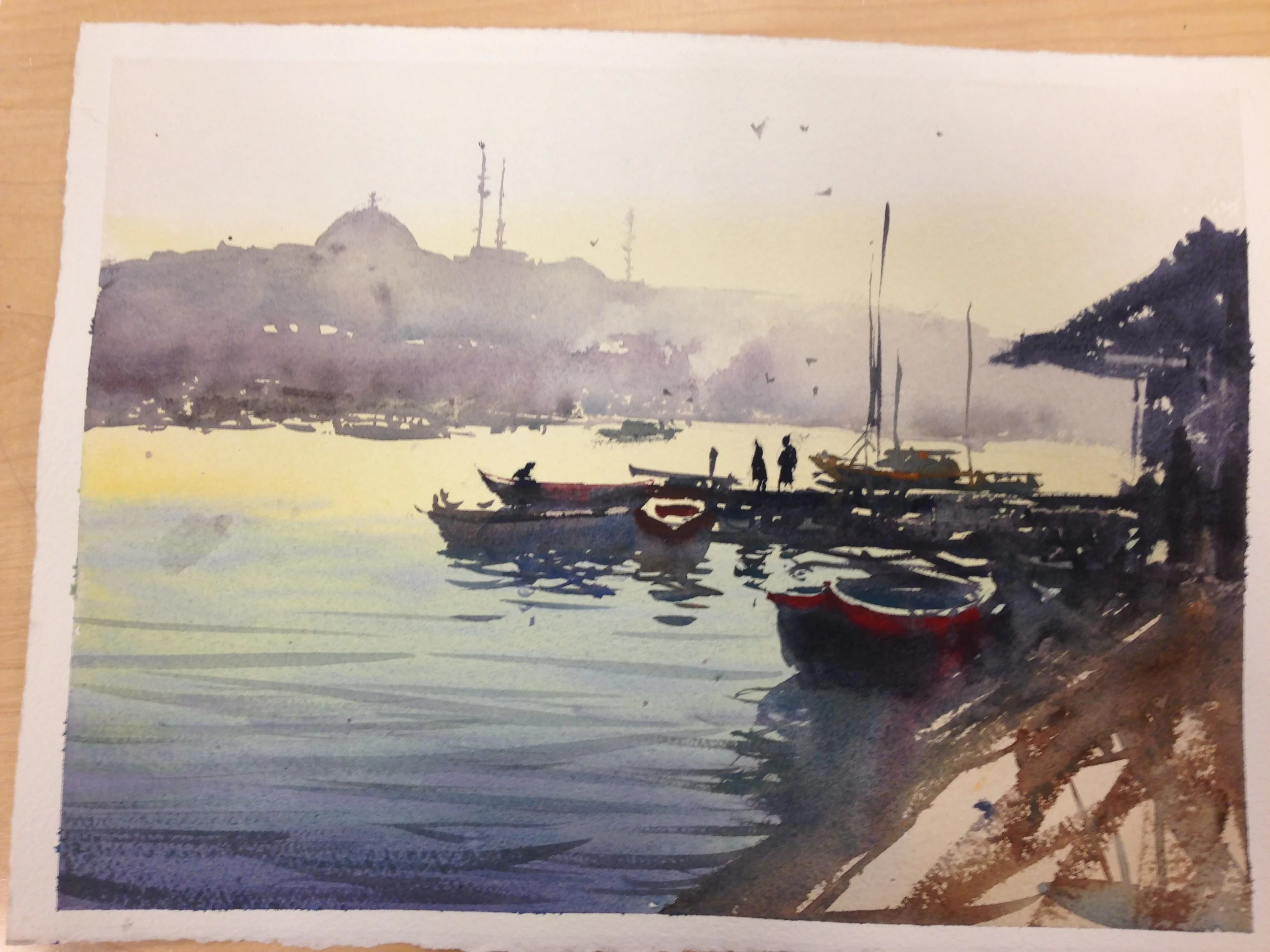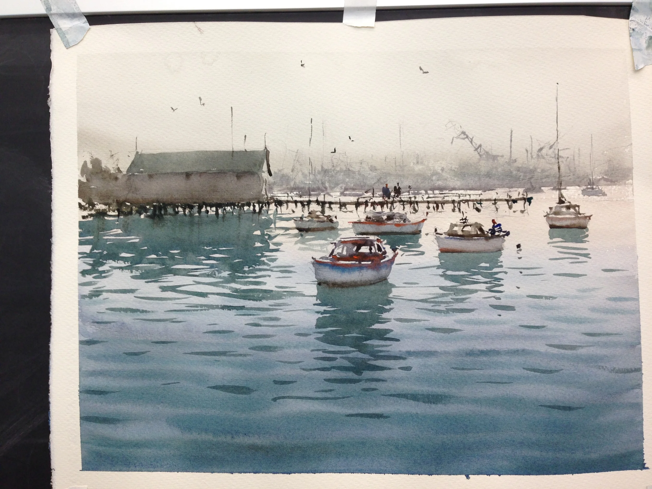 The soft background wasn't too hard, but once again, I dove in a bit too early, and my marks dispersed a bit too much- it almost looks foggy in mine. The wet into wet in the foreground was easy to trip up on. My first go was too pale. Joseph came over the top of it for me, and pushed a richer darker value in. Alternately, he felt my reflections were too dark. I also had too many small, slashing lines for my rippled reflections. The building was easy enough, but the boats... eh. That's something I would need to get better acquainted with, if I were to paint more of them. Cows and boats the first day. Tough!
