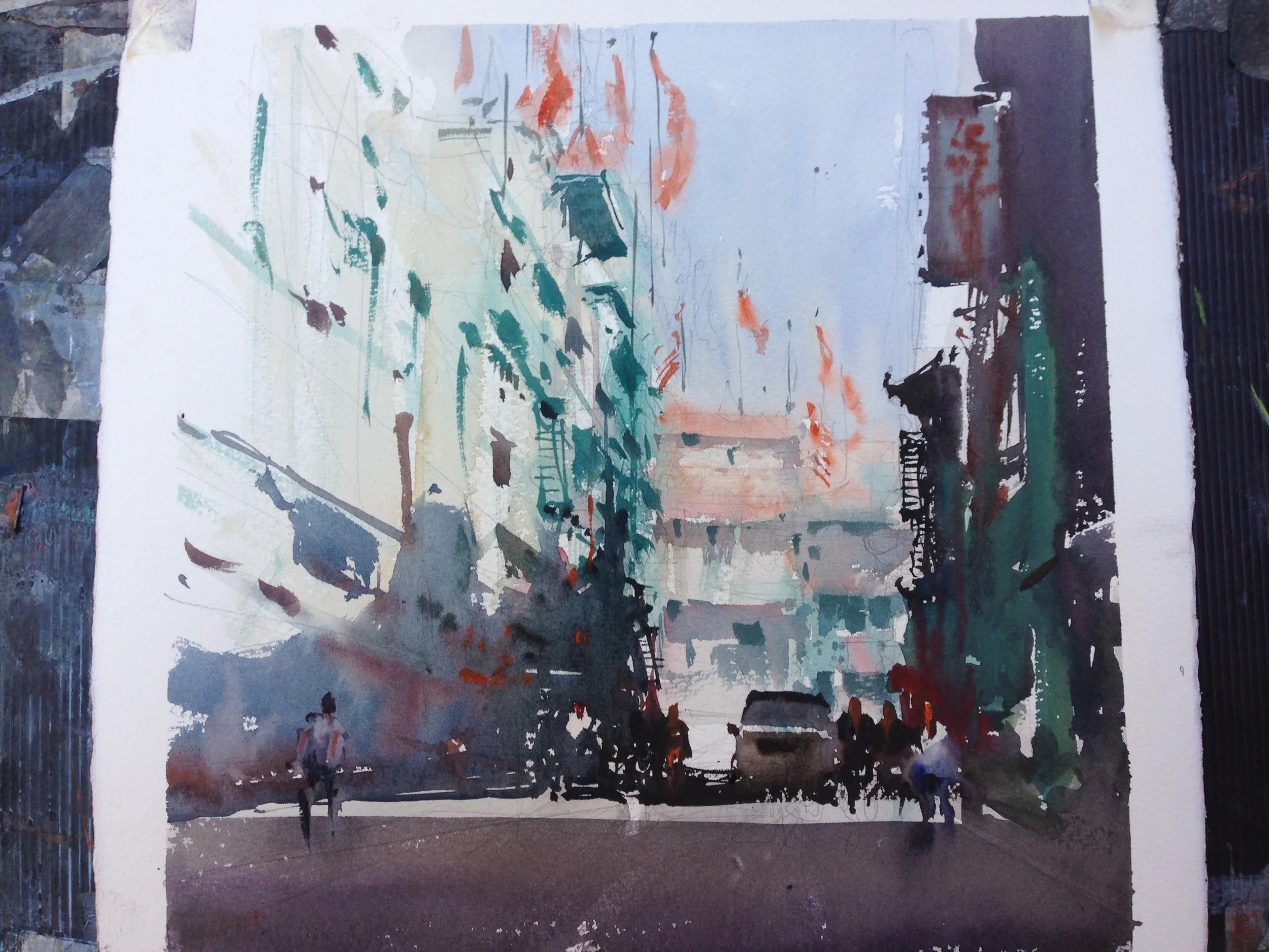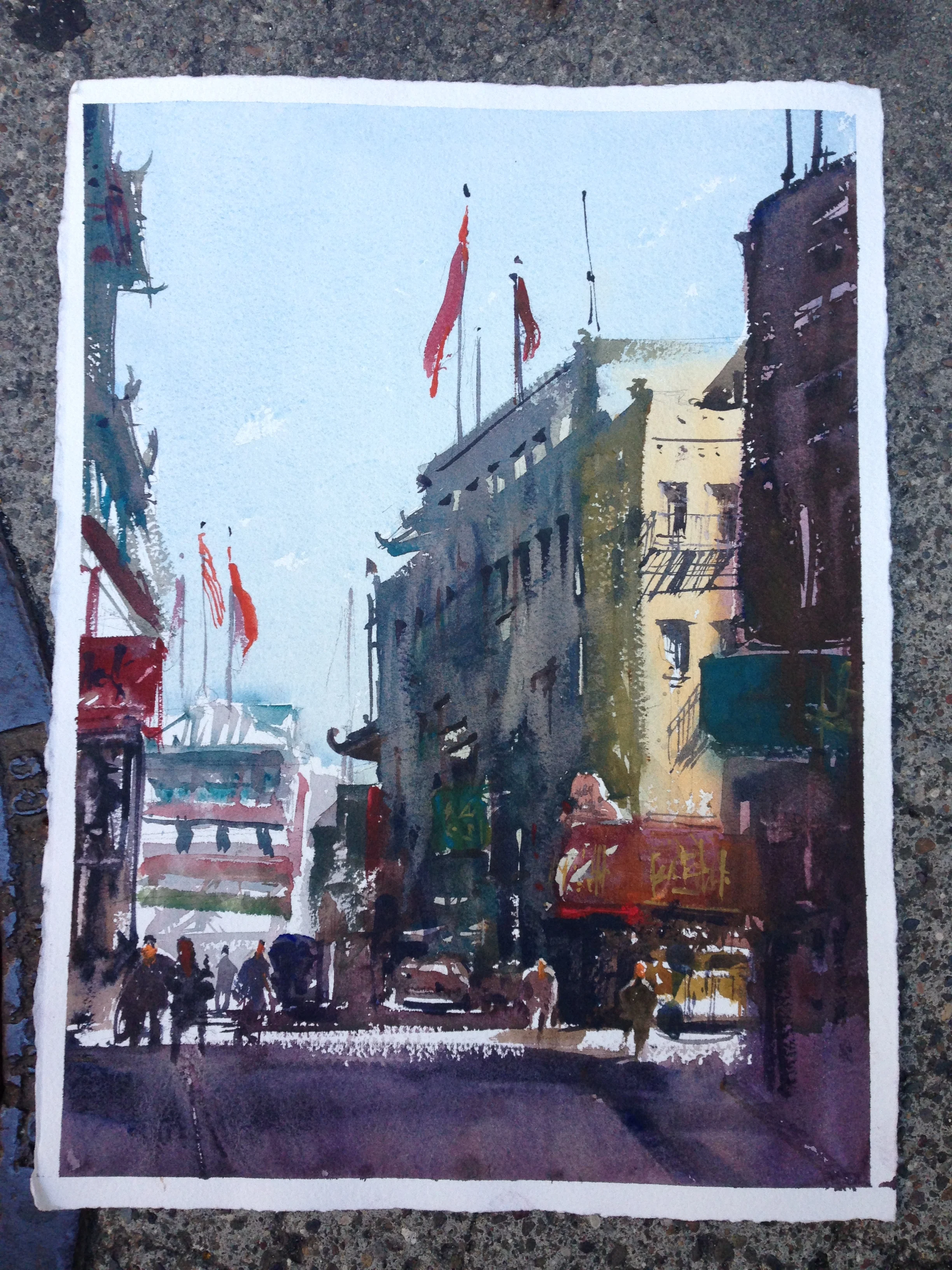 This is in Chinatown. We actually painted slightly different compositions here. I wanted to capture the light on the building at the corner, that then snakes across the street. I did ok up top, but lost my lights on the red awning, which should clearly be paler. No real remedy for that, but to do it over. Sometimes, however, if I'm dissatisfied with a mistake like this, I'll make a mixture (Chinese White and the local color I want) and map in the right values to "see" it. It ruins the painting, but makes it easier to paint it better the second time. Joseph did give me input on the shaded buildings. The primary building on the right, with the flags on it, was a bit flat and warm. He suggested going over it with a pale wash of green, to cool it off and make it feel more in shadow. I did so, loosely, dropping values into the wet wash and was happy with the choice.
