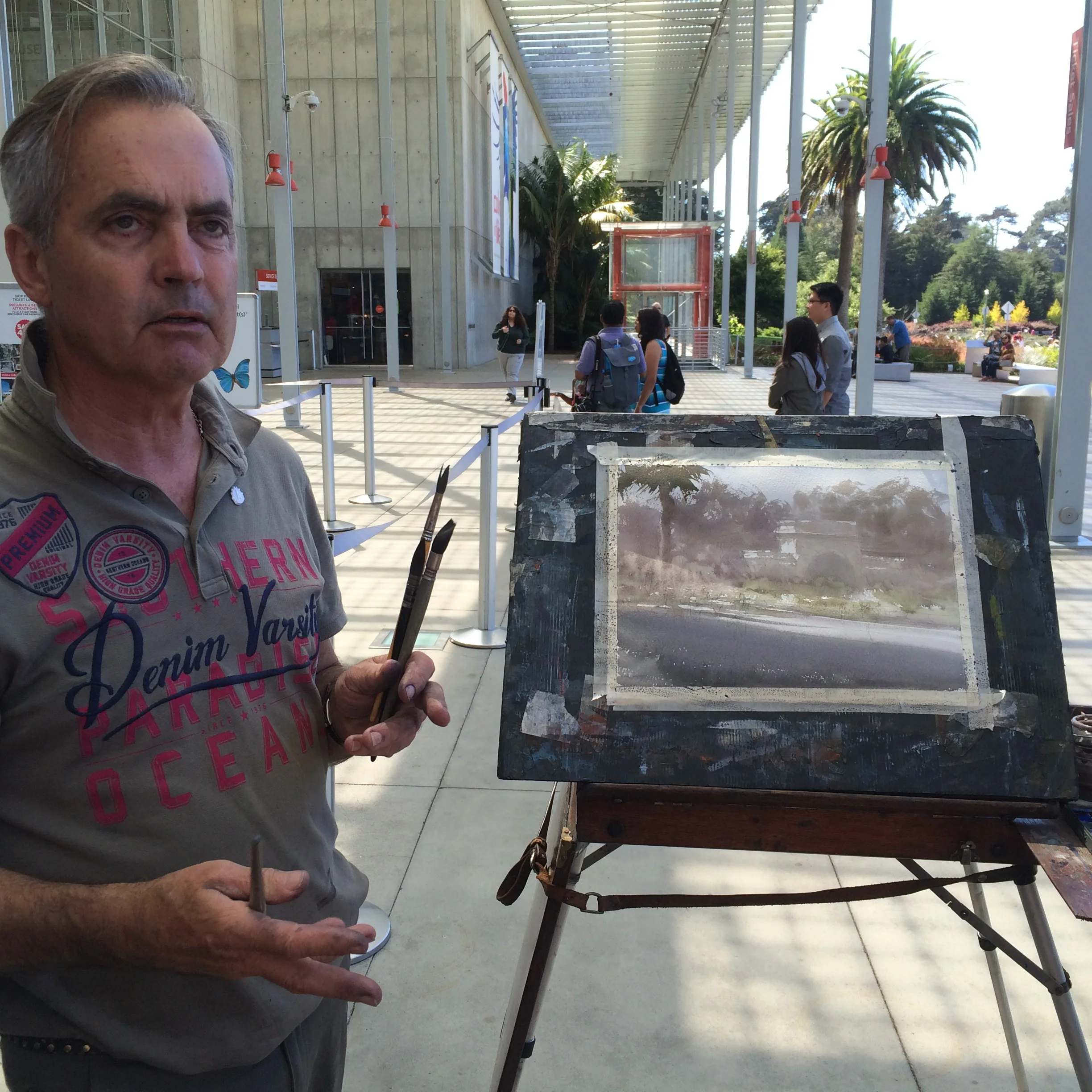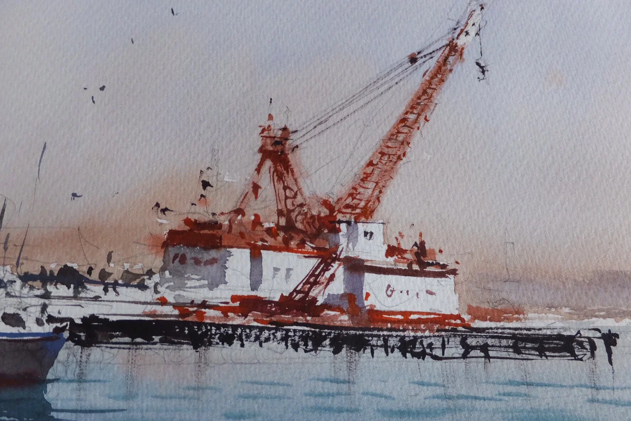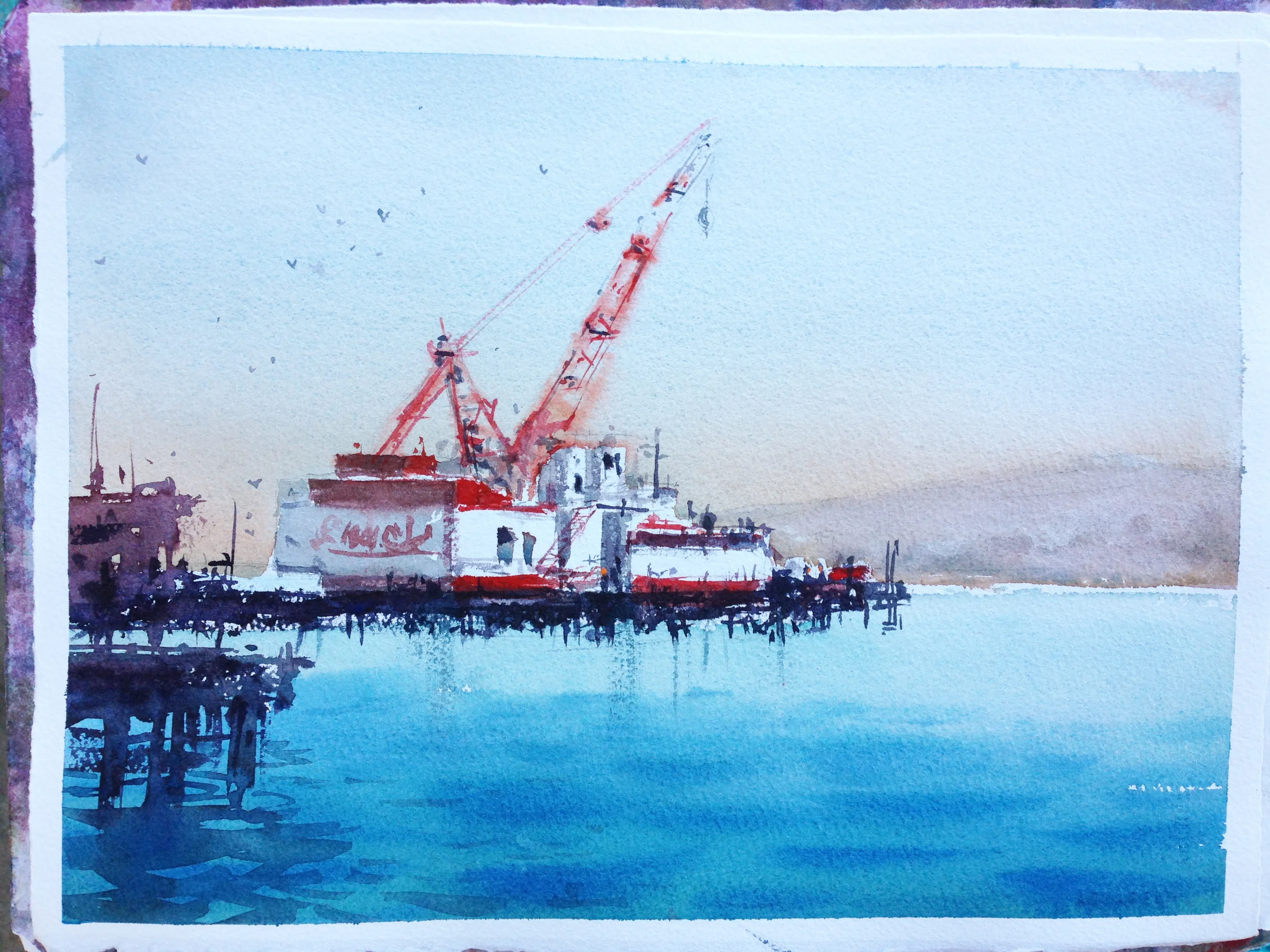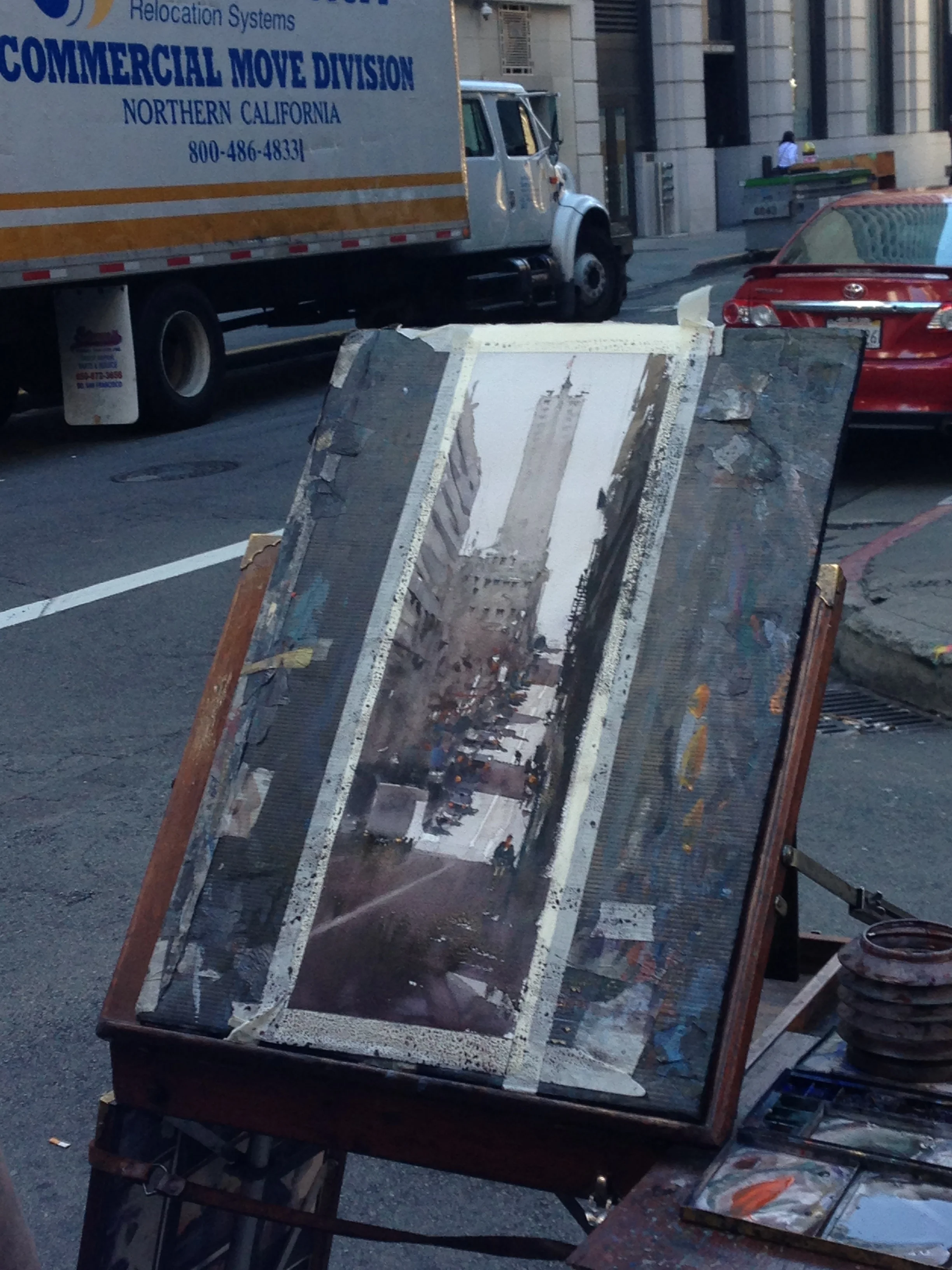 This was down by the Embarcadero. Joseph pondered painting the bridge, but he has an affinity for odd, unexpected subjects, and so went for this one. Something I particularly like is that Joseph kept just enough of a horizontal lighter value to make the dock read better. It's a small detail, but it's important for making the abstract work under the boat read better.