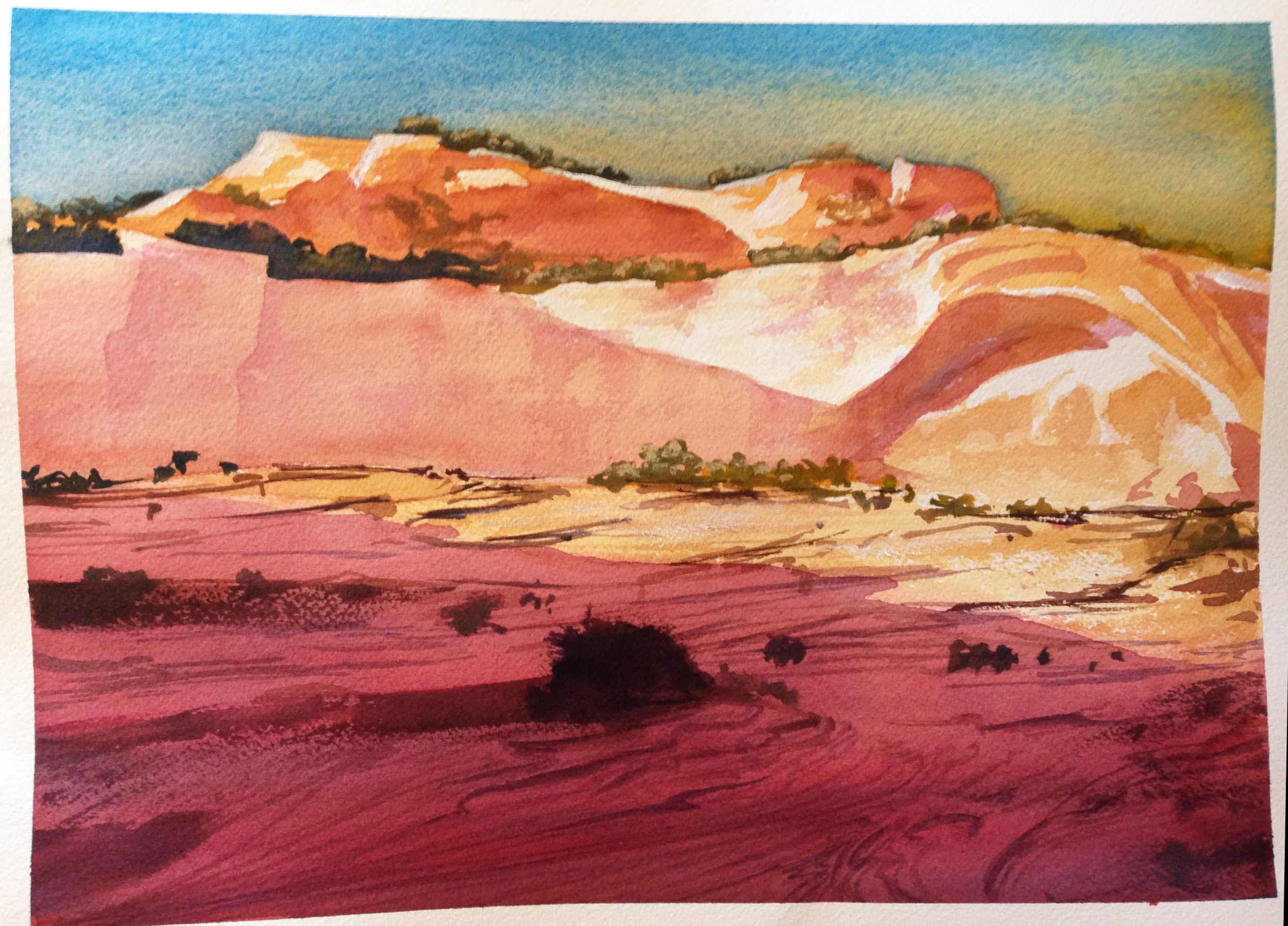For the 3rd iteration, I worked on a half sheet (15 x 22), and it took me about 3 hours. I came back to it after a few weeks off. I grew the sky to get that feeling of vastness of was after, and opened up the foreground some too.