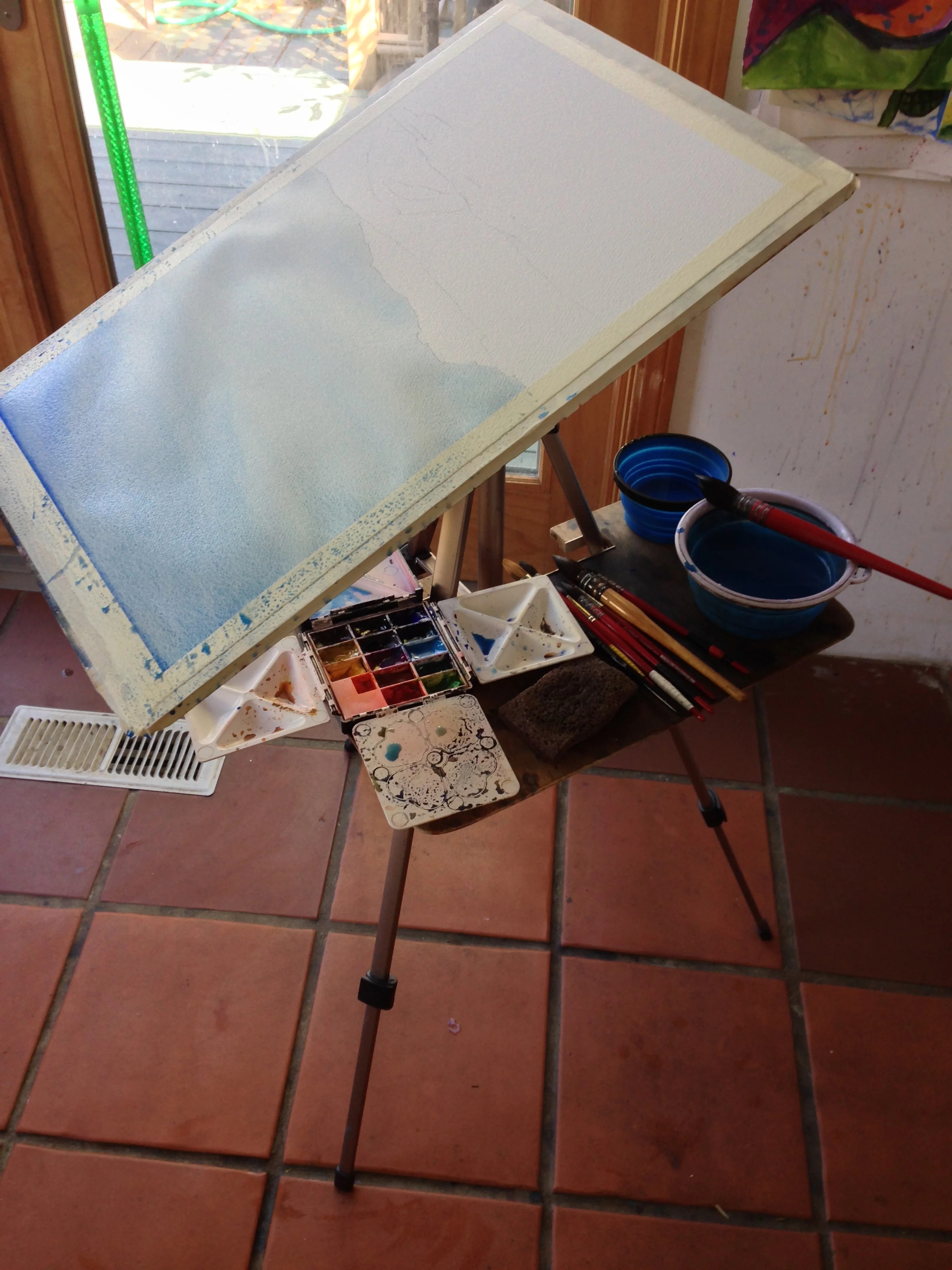 Here I'm painting the sky "upside Down", to get it lighter at the horizon and stop any drips from happening.