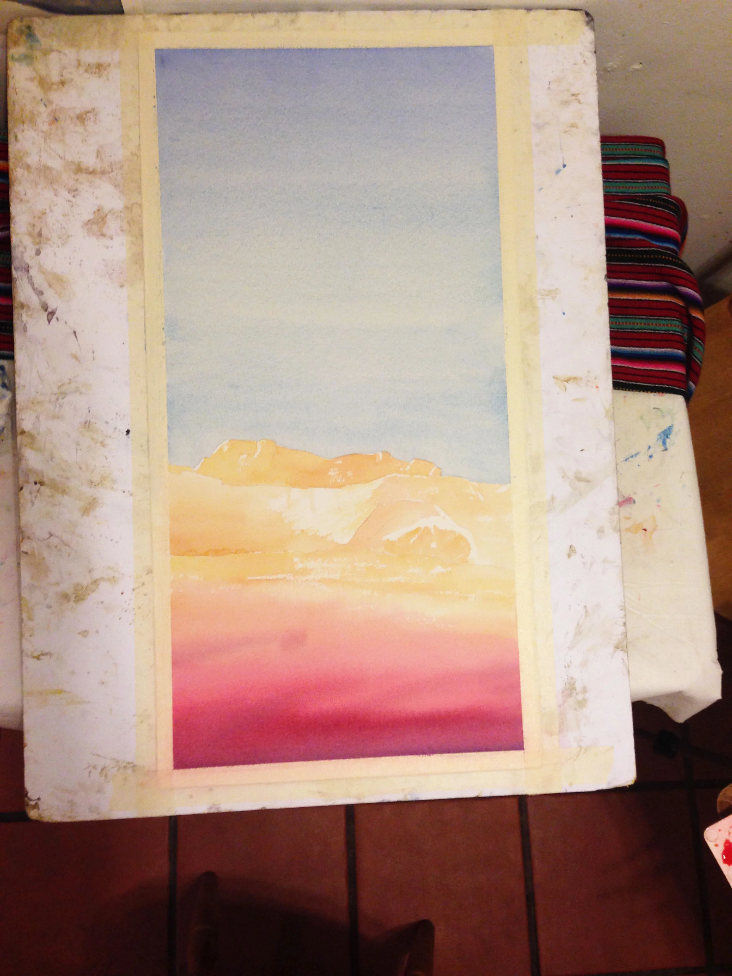 In this fourth version, I grew the sky and the foreground again, and decided to work on a slightly cropped full sheet (15”x 30”). It took me about 3.5 hours. I did it the same day as the 3rd iteration. Started around 900 and wrapped up sometime between midnight and 100. Phew!