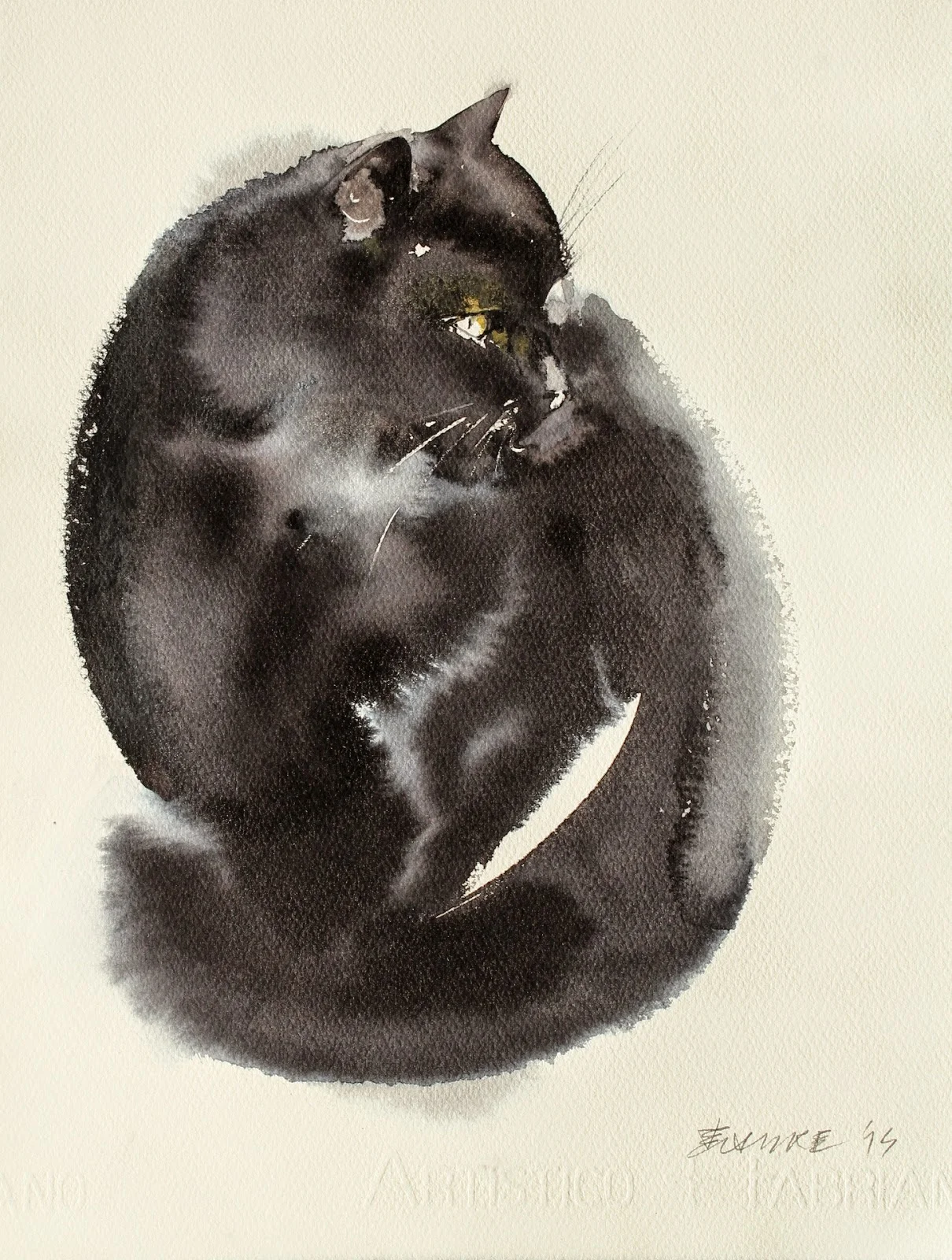 The same really goes for Endre Penovac as well. Here you can see one of his many cats and one of his chickens. There's so much is wet into wet for the cat, you almost can't see individual brushstrokes. And yet, looking at it, it's very very clear that part of its appeal is that it was done with the utmost minimum of strokes. Of course, the chicken has that absolutely fantastic tail, and the cockscomb- where we see drybrush work merging into wet work, much like with Ping Long's trees.