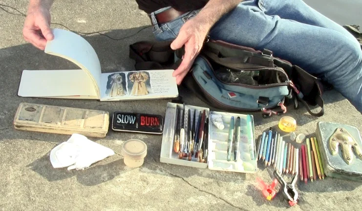 It's hard to talk about plein air painting without mentioning James Gurney. Even though his setup is super low key (no tripod at all), he is such a good artist, and so very engaged in watercolor work (amongst other media) that I feel the need to mention him. He has a post all about "Watercolor in the Wild". He talks all about his tools, his paints, his brushes and his palette. It's very detailed, and is an excellent resource. He also has a video for sale, which he and his wife filmed and produced. He actually uses a tripod in the trailer, but I don't think it's listed in the blog post. I've not watched the video, but it has been very well reviewed. It's only 15$ (!!!) and the profits go directly to him. His blog, Gurney's Journey, is also excellent and full of lots of many bits of good info.