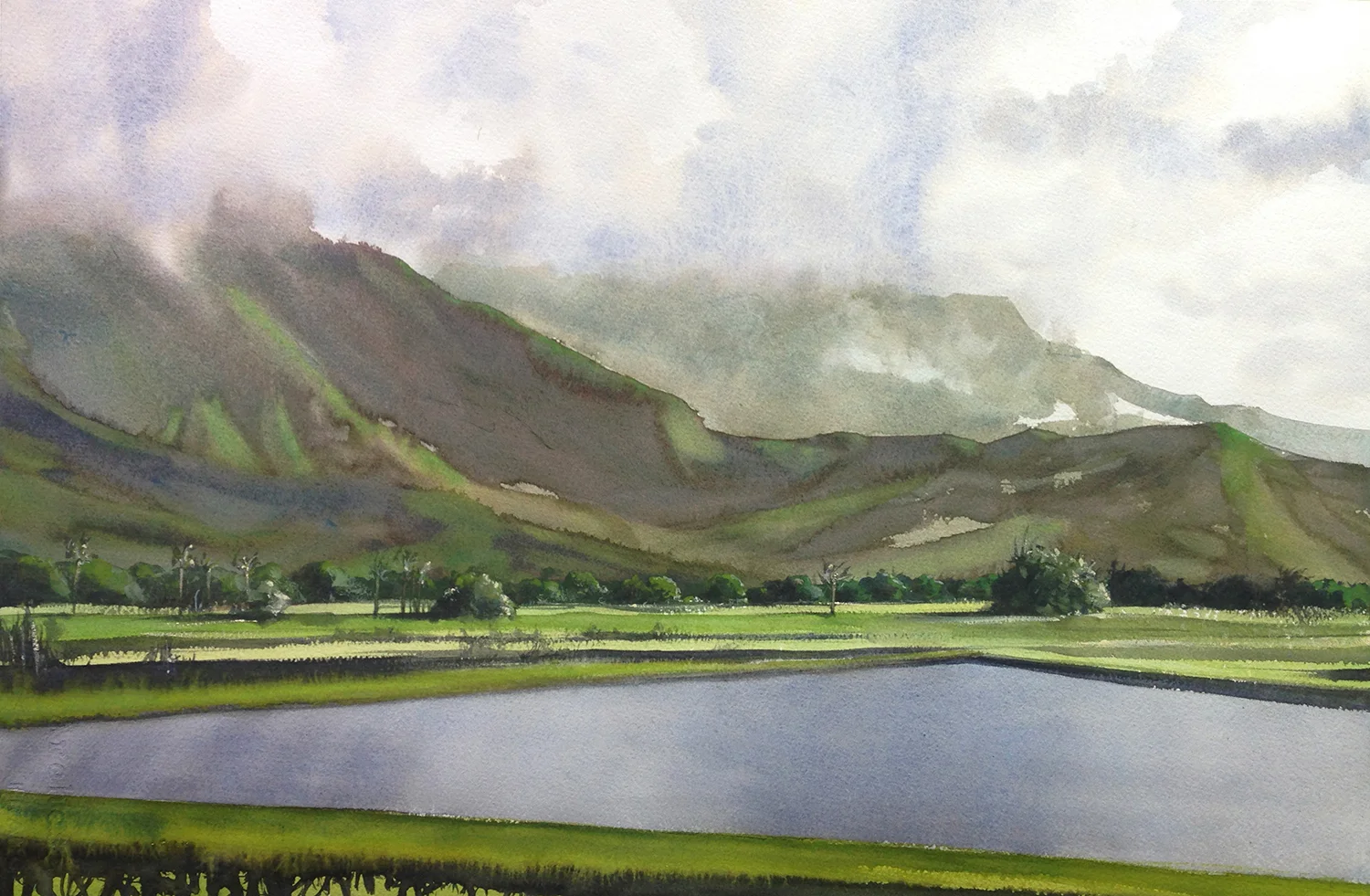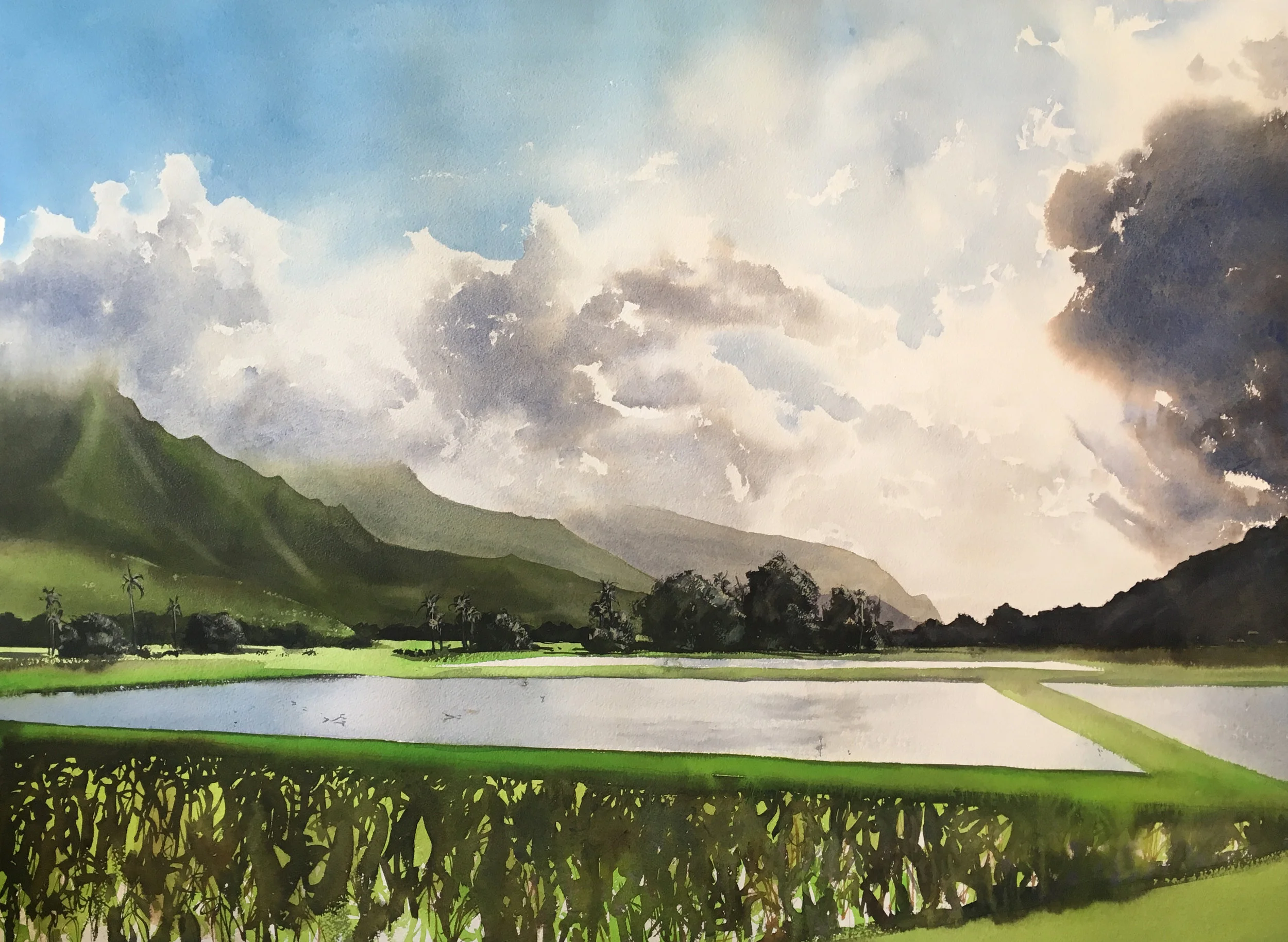 In an attempt to catch the top of those billowing clouds and to open up the bold texture of the taro fields in the foreground, I switched to a vertical orientation and worked on a full sheet (30"x22"). As I developed the piece, I felt that the clouds were too crisp. So I tried a new technique, and, after everything had completely dried 100%, I lay down a very wet, diluted wash of Ultramarine and Burnt Sienna over the entire sky and clouds, bringing it down into the mountains with water. I don't do much glazing like that, so what was most impressive to me was how tough the underlying wash was! The layer on top softened the whites and very mildly softened some edges, but only a little. Very little bleeding. All in all, it did a good job of pushing the clouds back and reducing how “sharp” they felt at first glance. Additionally, through contrast with the clouds, the midground trees and foreground taro fields became sharper and more vibrant.