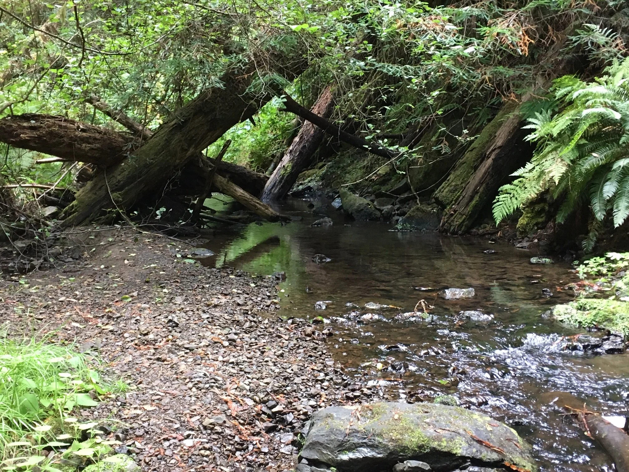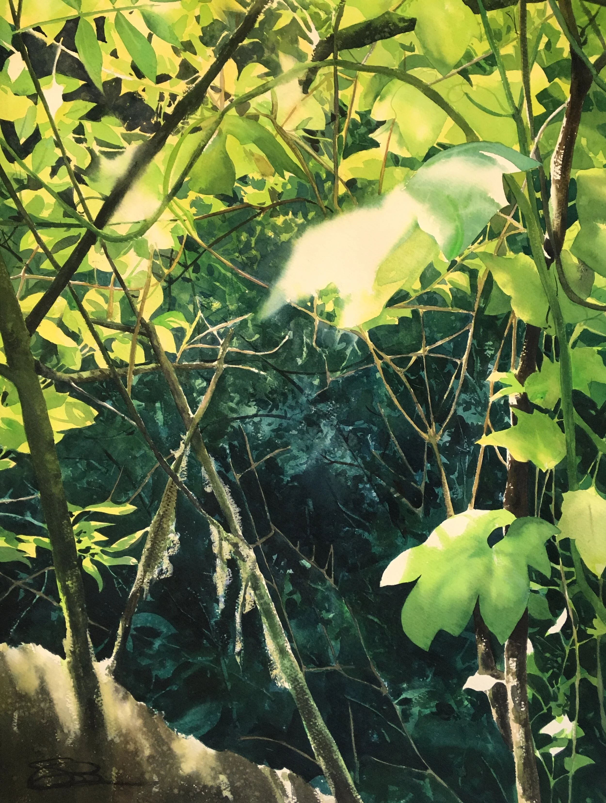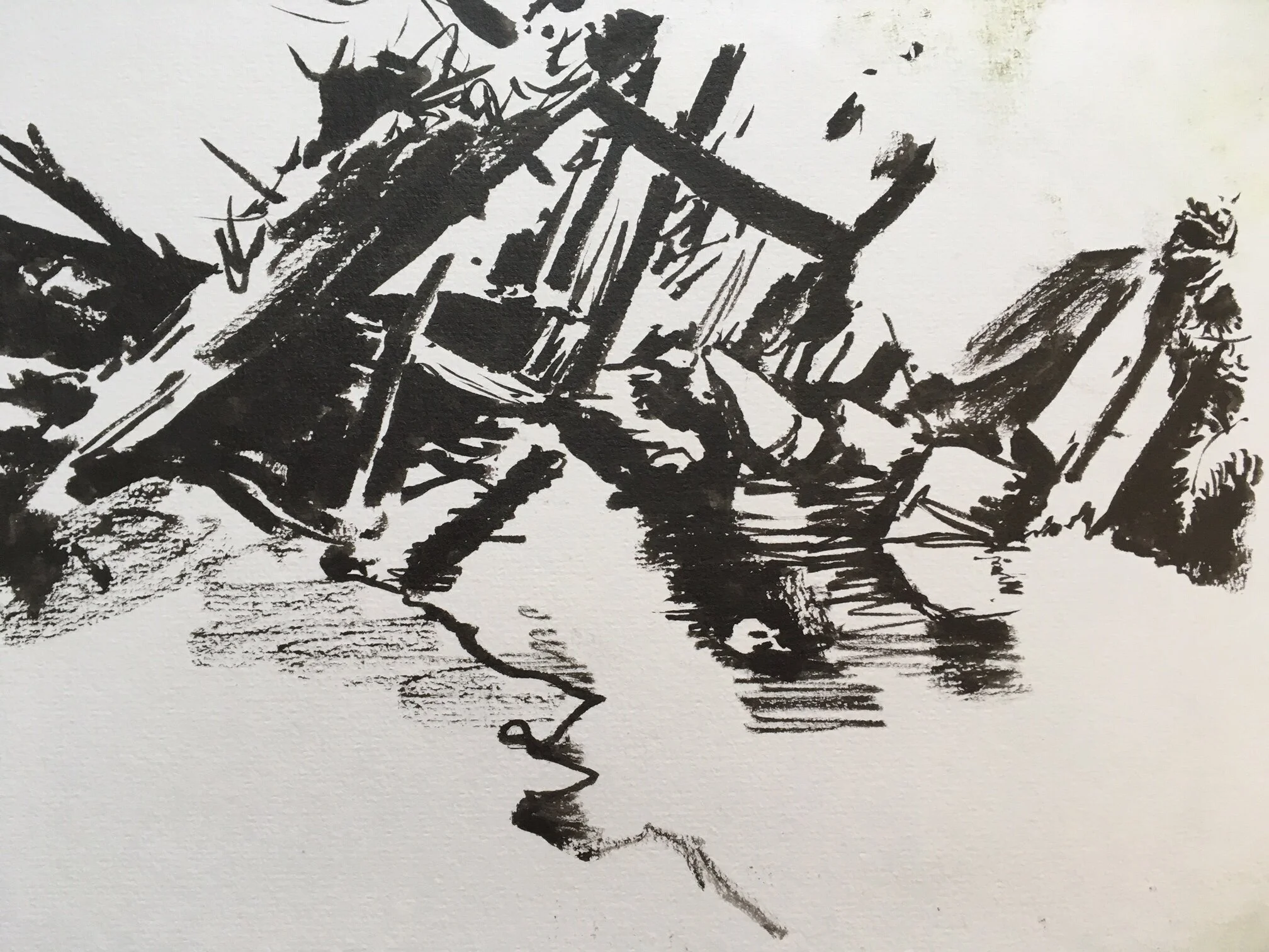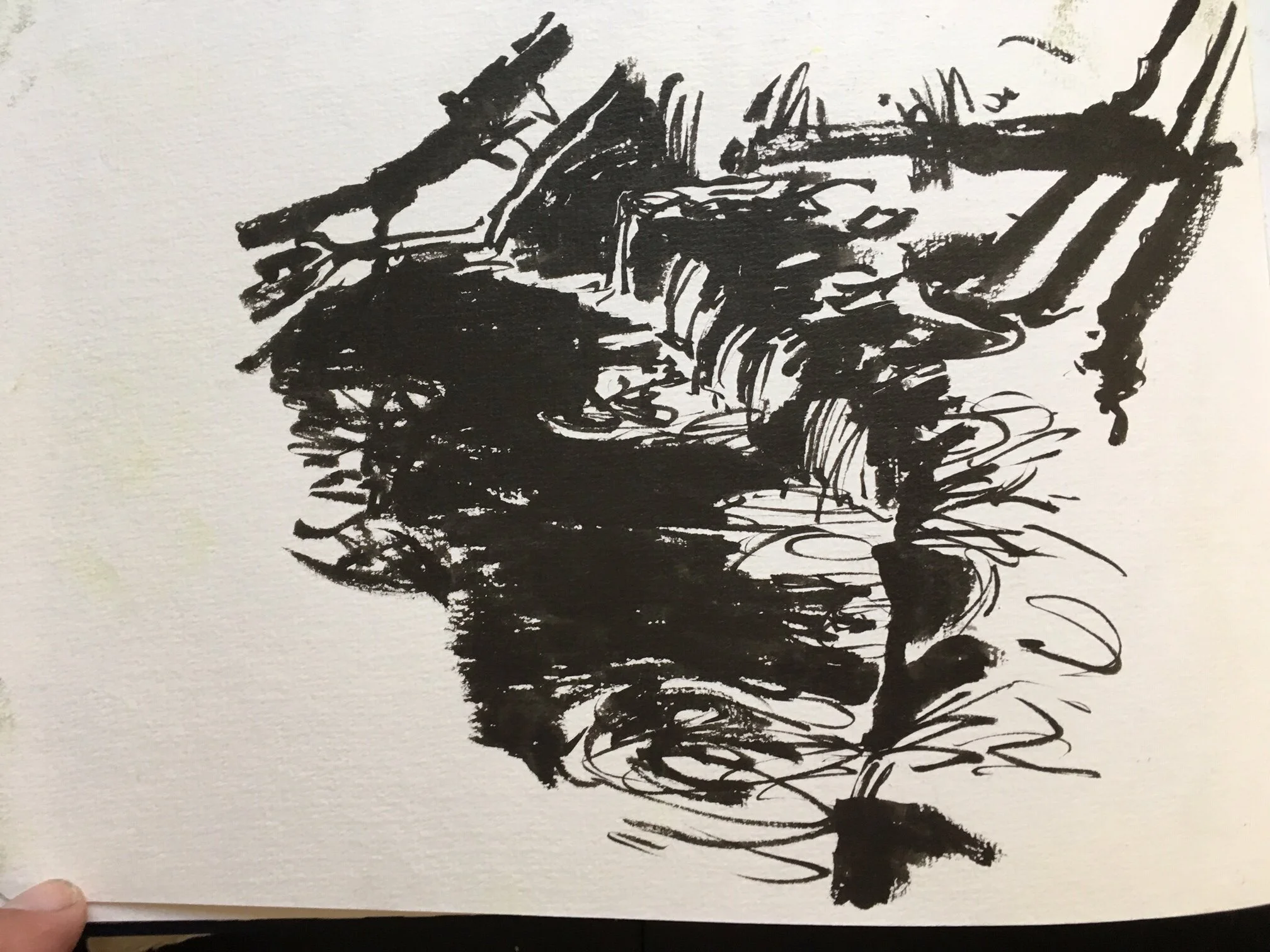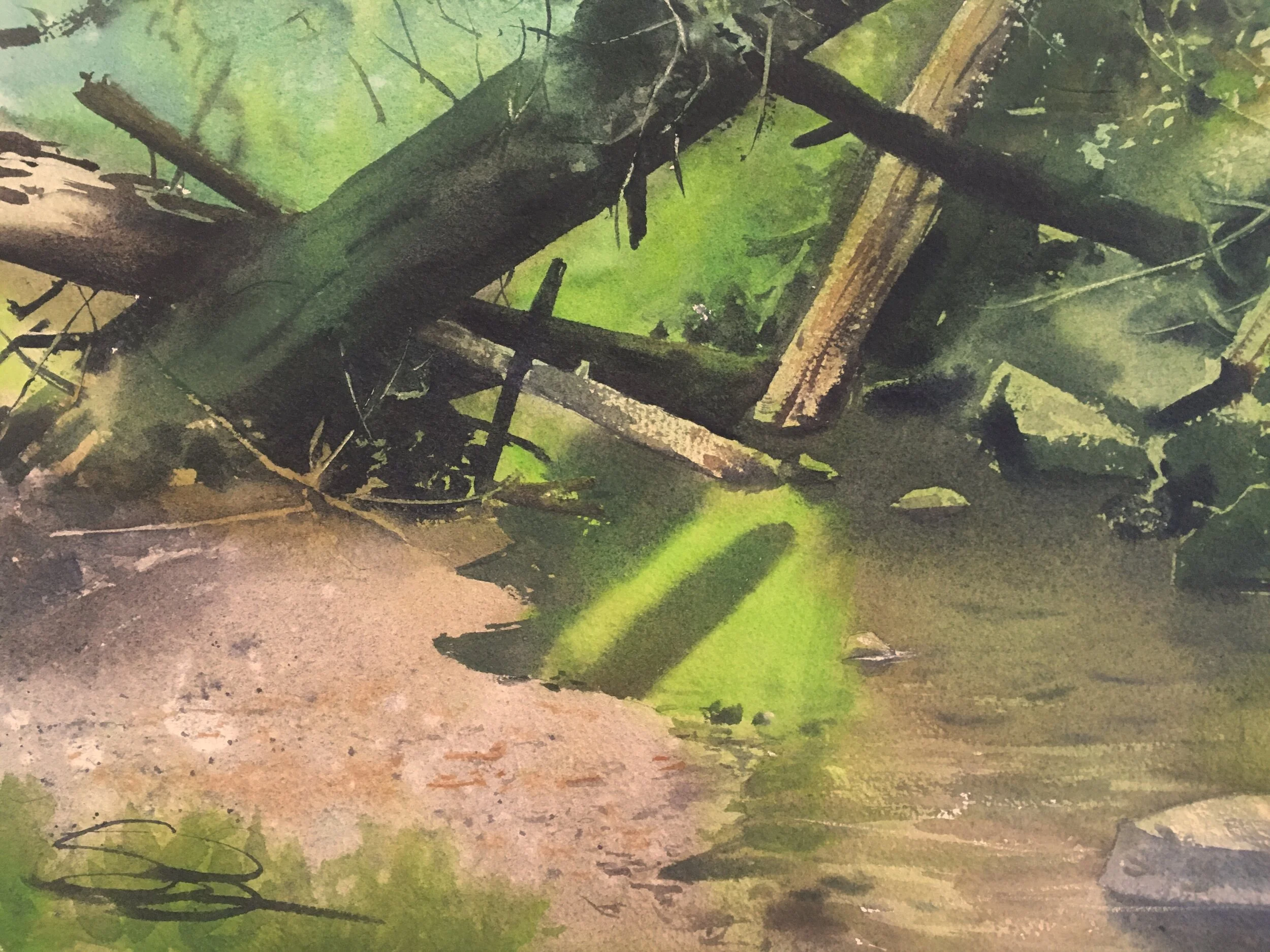 For this piece, I was very intrigued by the tangle of shapes in the logjam. I also knew that each log needed to separate itself in some way, so it could be tracked across the image, if it was going to be legible. This was a big push with the notan— how to reduce things, remove things, and by doing so choose what is essential. Note how much foliage and how many stones in the stream I removed. They’re both still there, but the story is about the logjam.