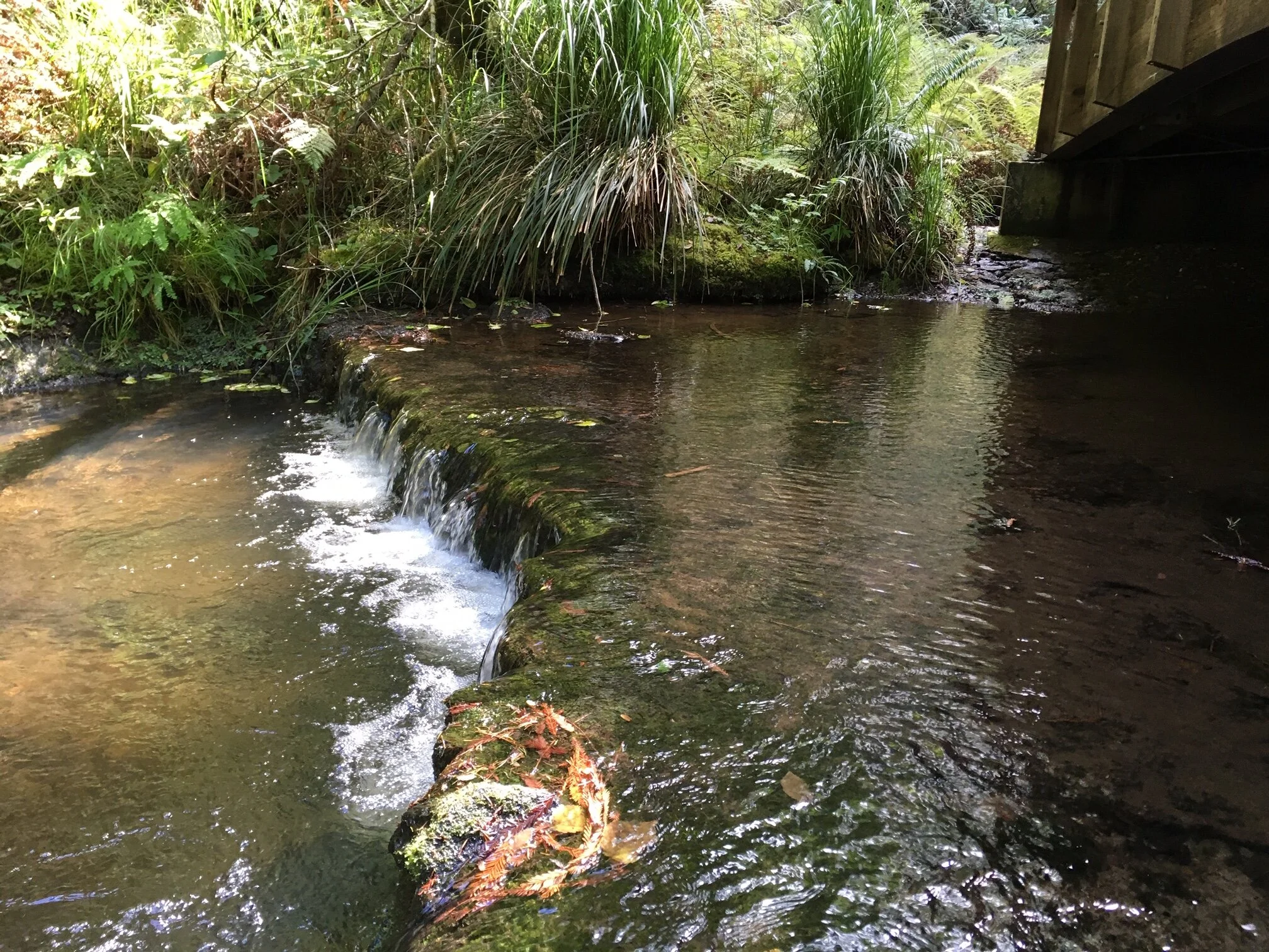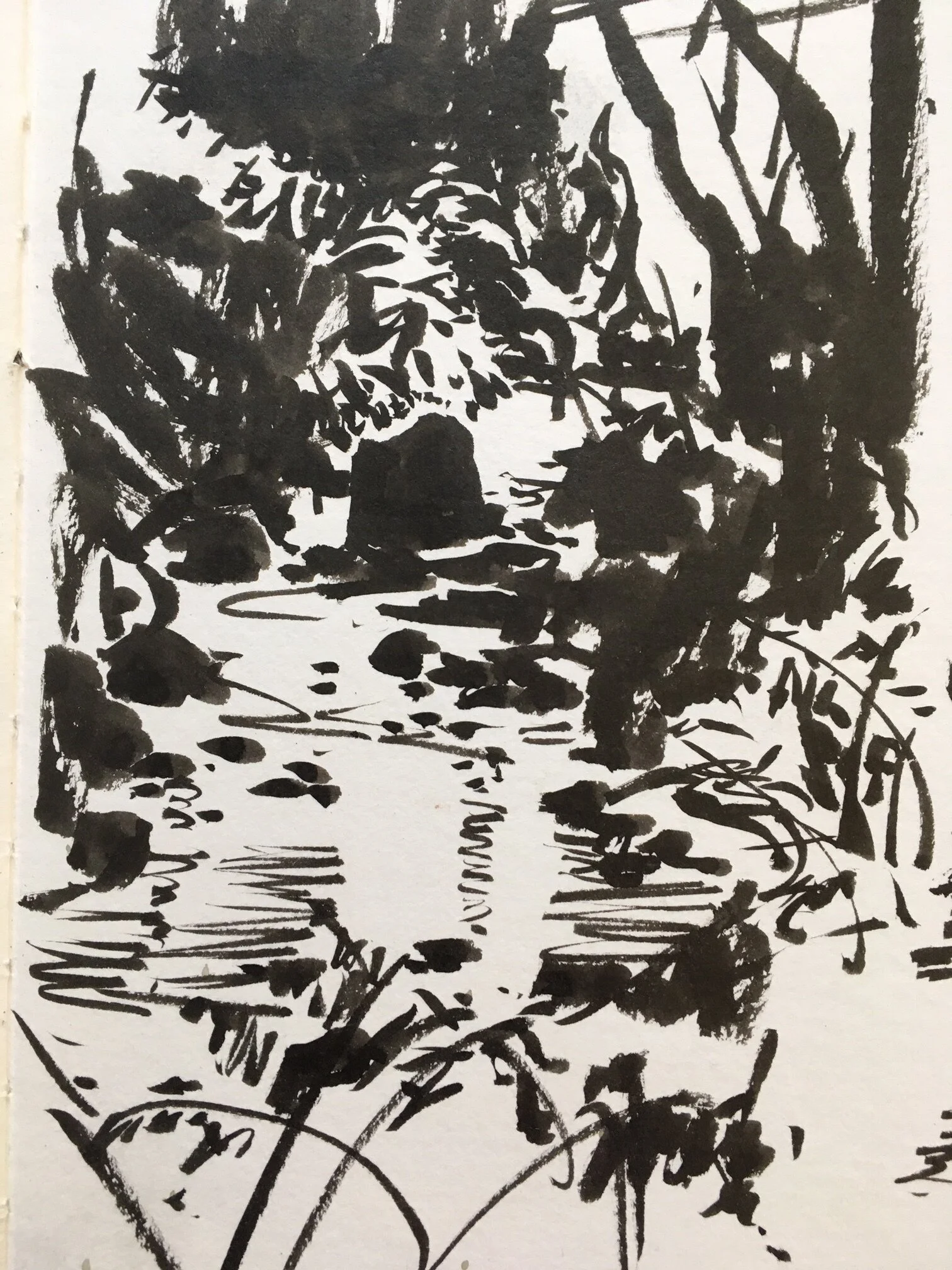 Here, I stepped down from a bridge to the bank of a creek, and was pondering painting this little waterfall. The notan convinced me otherwise.