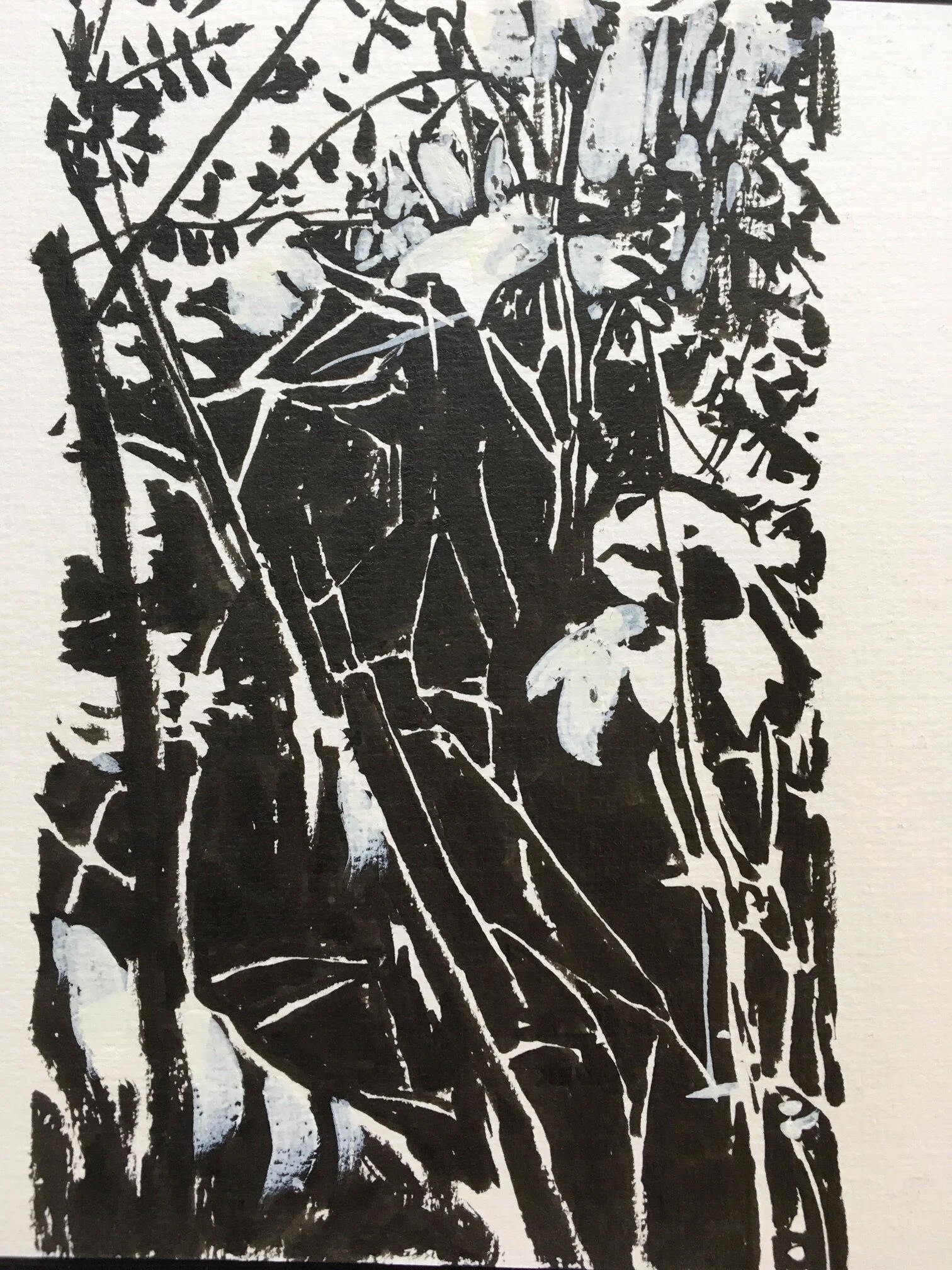 In the studio, I’ve also been doing notans. I was interested in doing the image below, and I knew, even before I began, that it would be difficult. It’s a mess of shapes. I wasn’t sure I could do it. Doing the notan actually convinced me it could be done. It helped me simplify, choose my details, and assign them to the darks or the lights. You can see how I corrected as I went— there are spots where I went back in with gouache to push the lights again.
