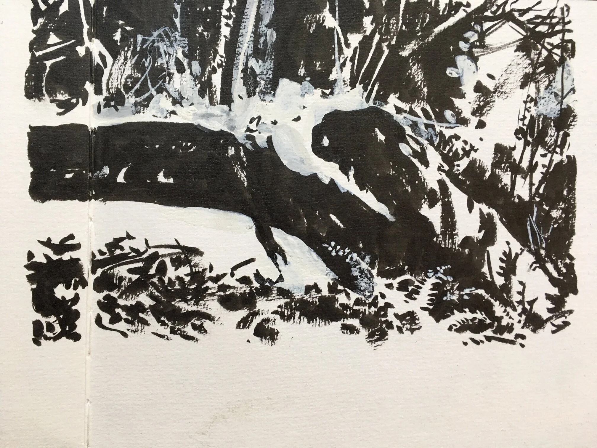 …what immediately became clear on doing the notan is that there are lots of mid-value shapes around the log that don’t let it “pop”. The area under the trunk is too close in value to the dark log, and the area above it has the same issue. If I want to paint this, those things will need to change in some way. You can see my white-gouache corrections in the notan, where I began to massage the image, creating contrast so the log will read more dominantly.