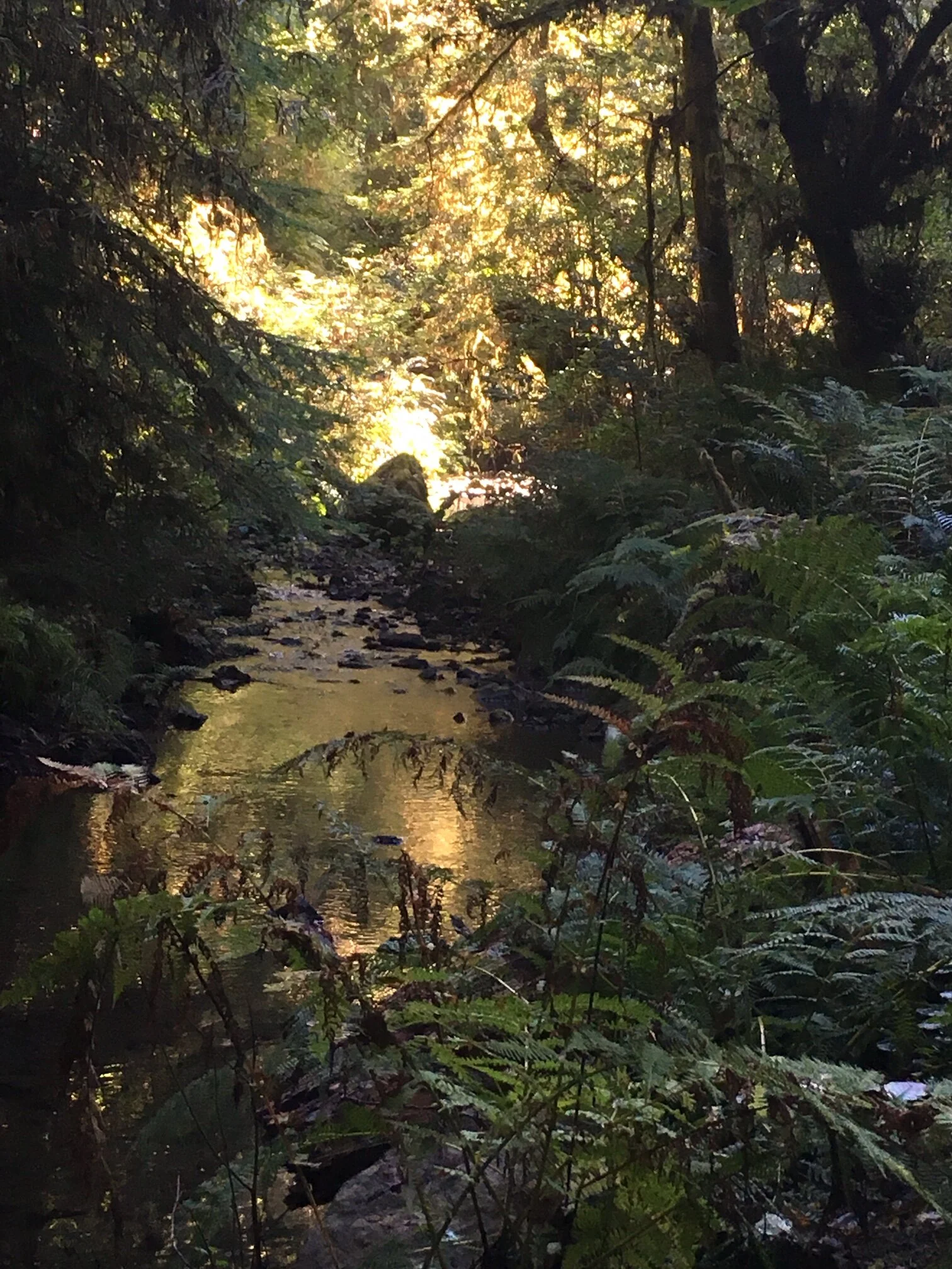 Here you can see the photo, which shows how far away everything really is, then the 6 x 4 notan, and then my 15 x 11 plein air piece. What the photo makes clear is how busy the location was visually— ferns everywhere, branches and twigs and such. My goal is to simplify and tell a story, and to capture the feeling of a place, the sound and smells. Our eyes do a very good job of pulling out objects and separating them from all of the hubbub, but photos do not. I know, from memory, that the site didn’t look as crazy as this photo. This is where the notan is very useful. Drawing it helps my mind see what my eyes see. This informs the painting process a great deal.