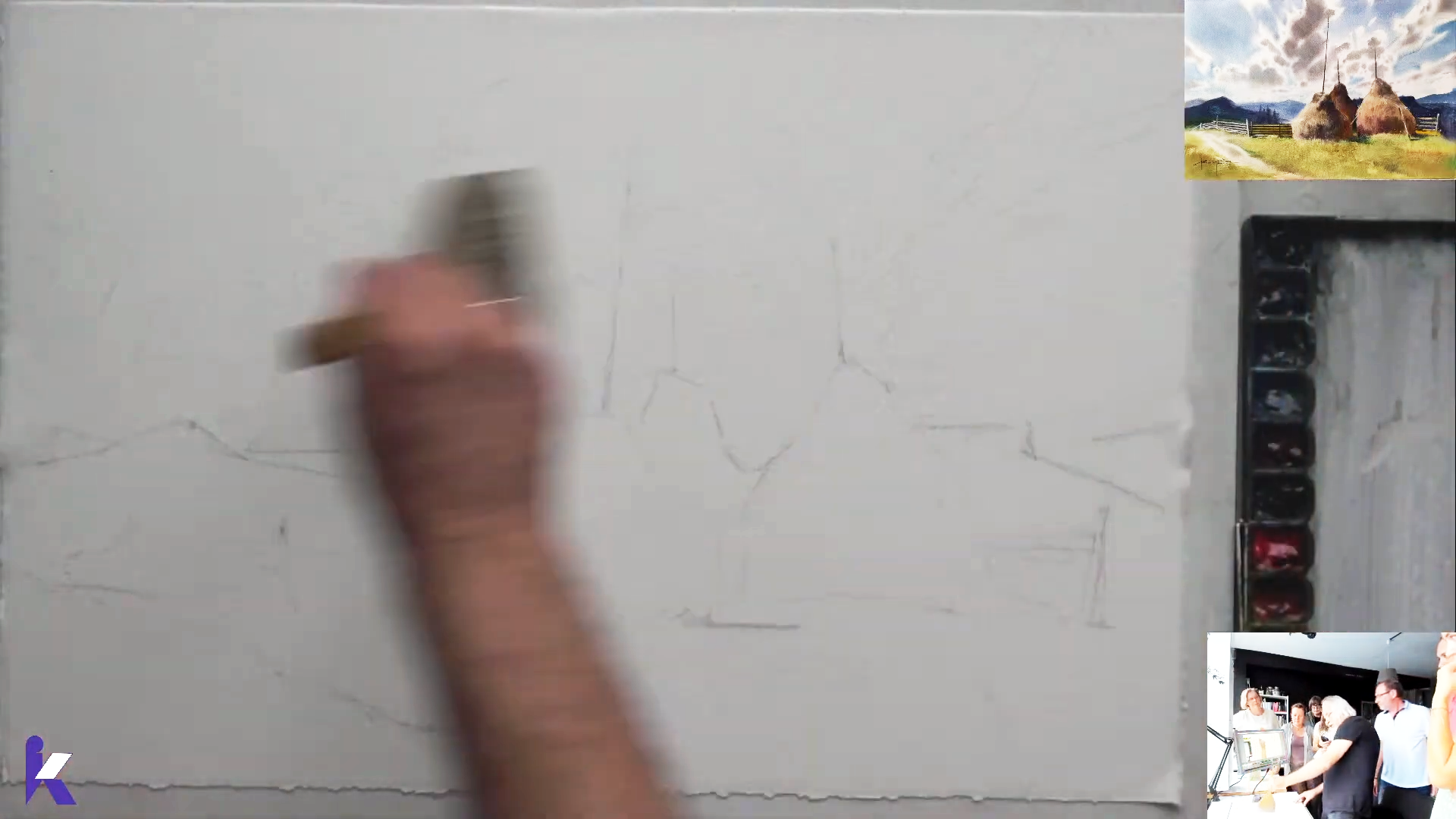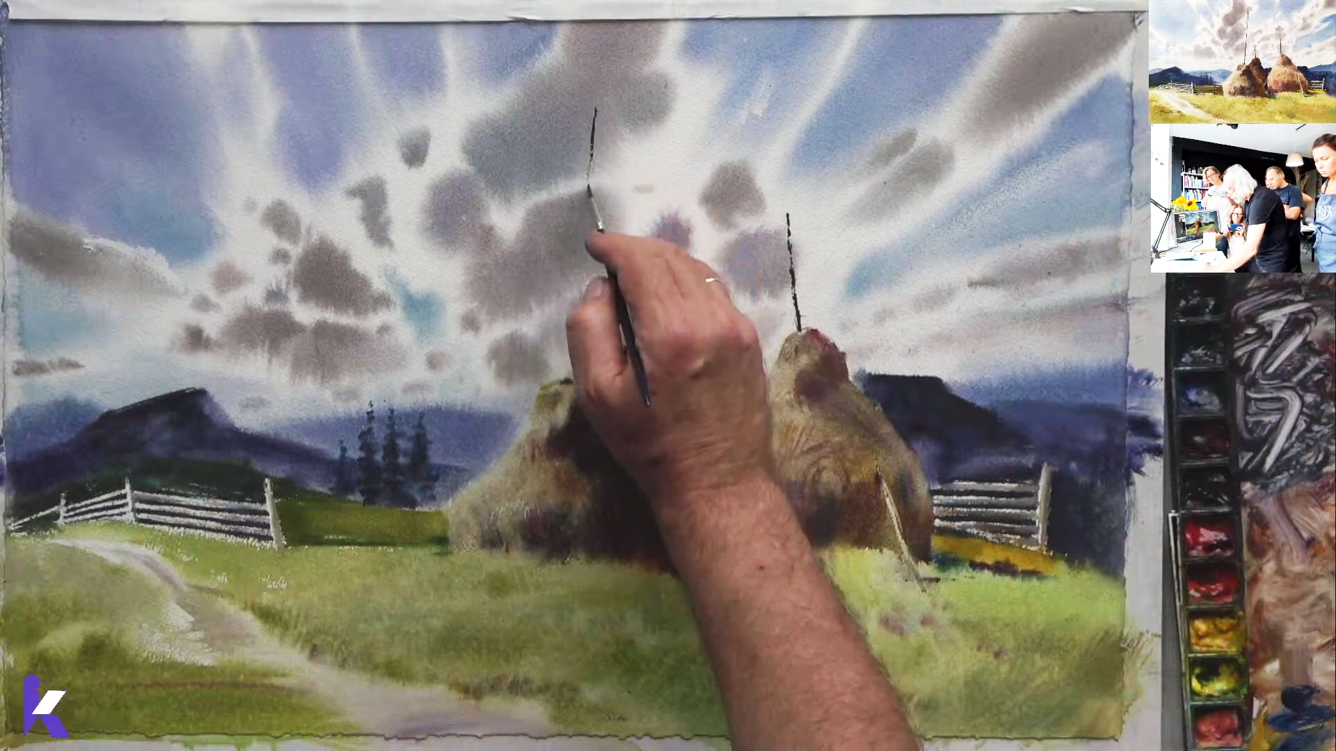 After a 20 minute break, Igor came back and got to work. The first thing he did was gently pre-wet the focal point (the two haystacks). But not the whole area! He was very clear about doing it judiciously, so he could keep hard edges where he wanted. Then, he dove in with a small flat hake, to drop in the pale brown base color.