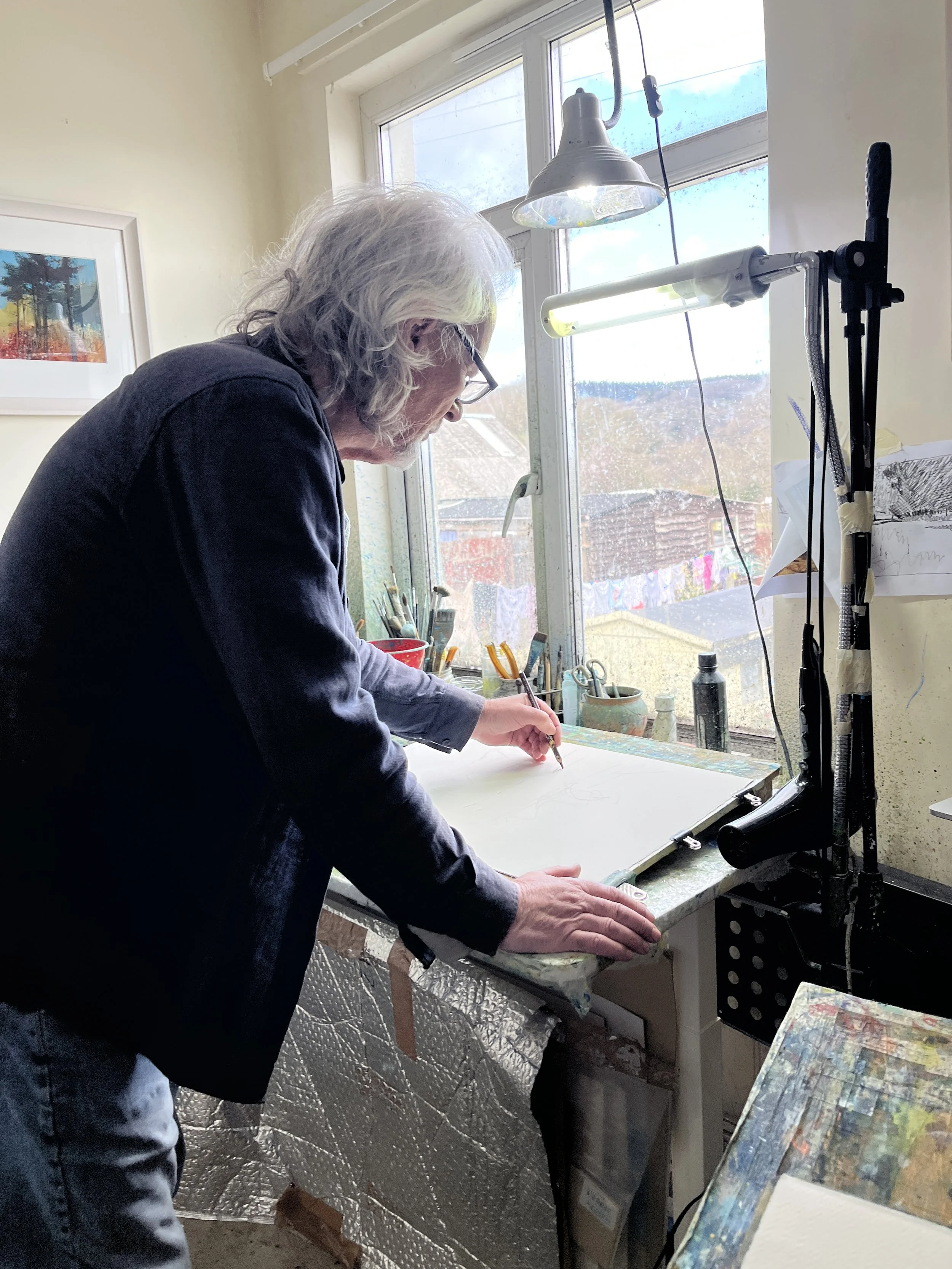 Next, he cut some simple strips of paper and laid them over the tree trunks, as a simple quick kind of masking tool.